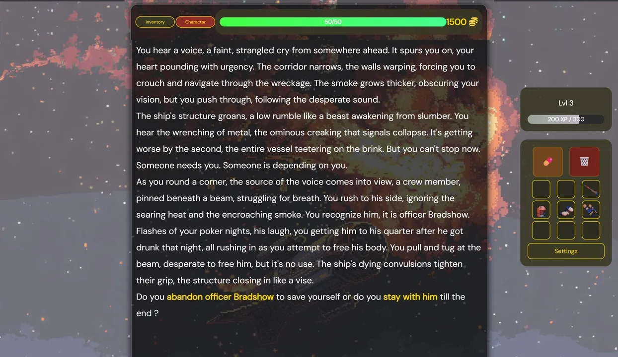 Un juego narrativo guiado por la elección con mecánicas de RPG, lleno de maravillas cósmicas y horror. Forja tu propio camino a través de más de 50 finales únicos. Haz trueques, mejora tu personaje, lucha y explora mundos alienígenas, superando todos los obstáculos para encontrar el camino de vuelta a la Tierra... y a tu hija.