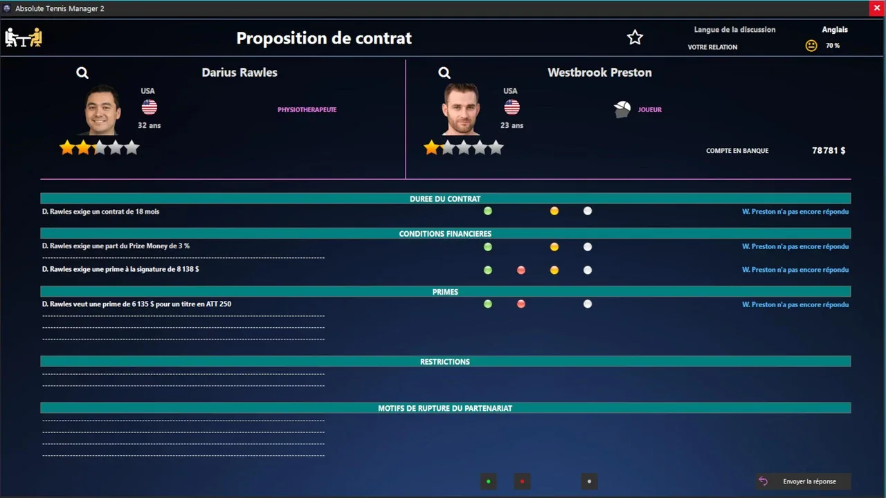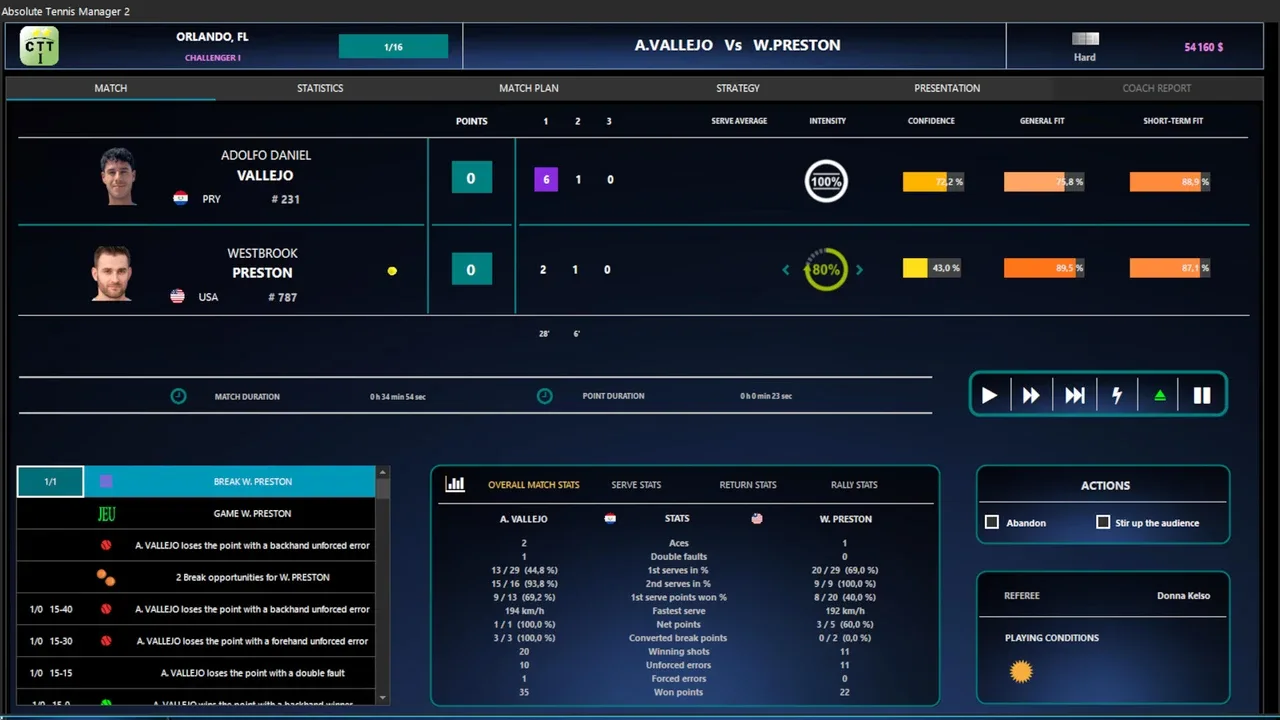 ¡Sumérgete en el mundo del tenis con ATM 2! Crea o asume el papel de un jugador y gestiona todos los aspectos de su carrera: calendario, entrenamiento, personal, vida personal... Construye tu leyenda, torneo tras torneo, y aspira a ocupar el último lugar en el Salón de la Fama.