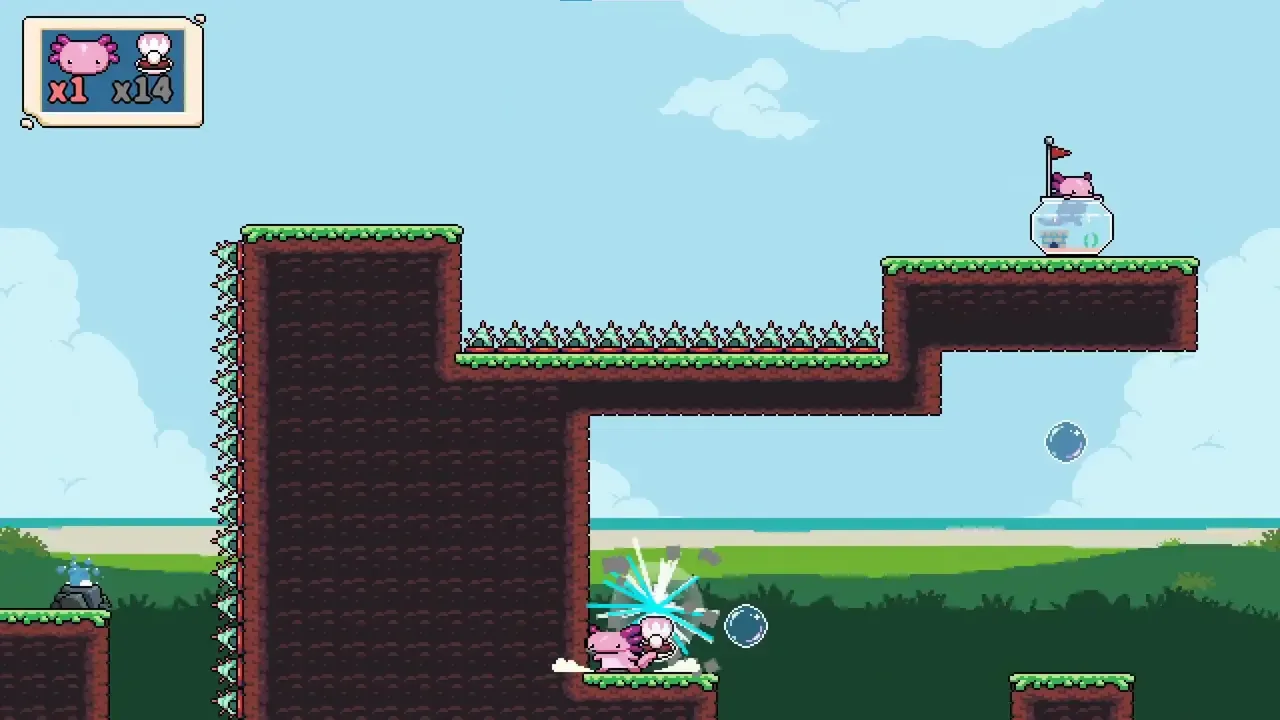 En Axobubble controlas a un simpático axolotl en un mundo de plataformas y creatividad. Tu principal habilidad es crear burbujas flotantes que actúan como plataformas temporales. Utiliza estas burbujas para saltar más alto, atravesar distancias peligrosas y recoger conchas mientras avanzas hacia la gran concha estrella al final de cada nivel.