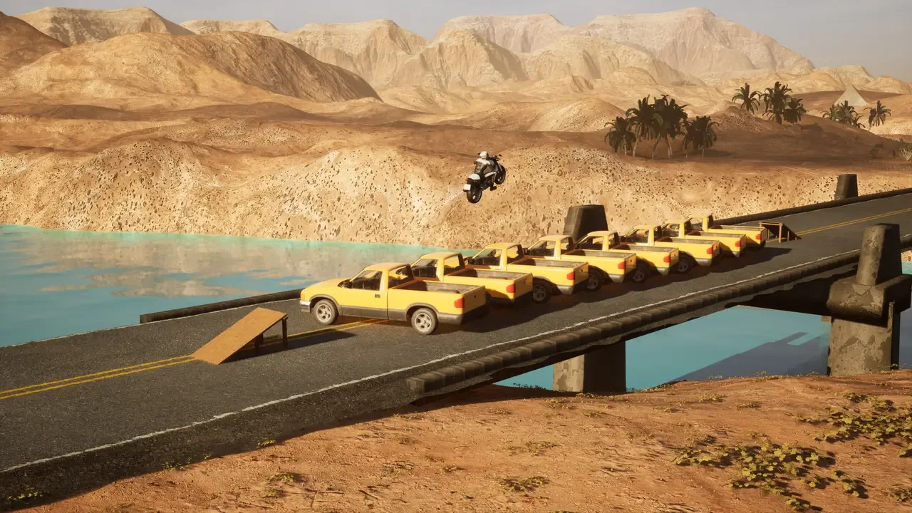 Beam Moto Driver Playground es tu patio de recreo para la velocidad, las acrobacias y la supervivencia sobre dos ruedas. ¿Estás listo para conquistar el desierto?