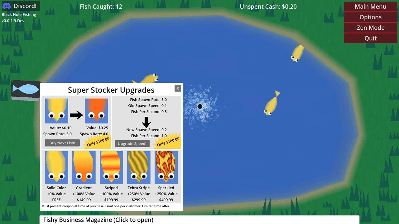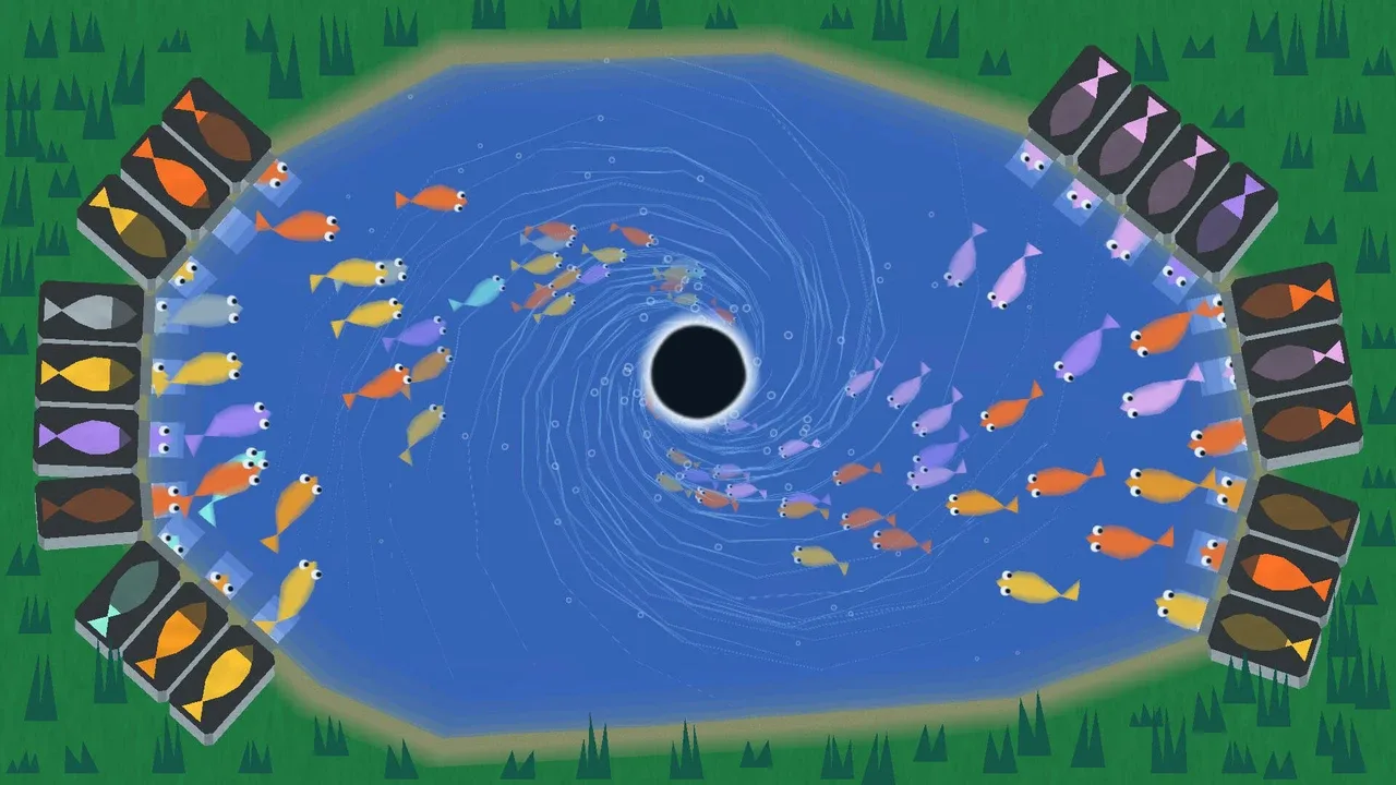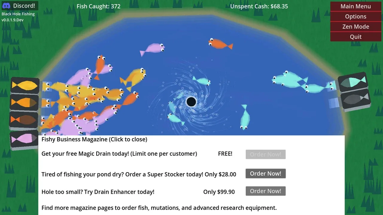 La pesca en agujeros negros es un juego incremental completamente normal sobre la pesca. No esperes llenar el estanque de peces modificados genéticamente, descubrir una caverna infinita llena de estanques para consumir, o destruir el planeta entero alimentando con peces infinitos a una singularidad. Sinceramente, es sólo un juego de pesca.