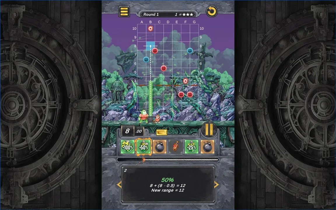 Únete al gnomo pirómano Cal y al trol Bomba en una explosiva aventura matemática, en este galardonado juego. Viajan por diferentes mundos con su cañón. Debes utilizar cálculos porcentuales para cambiar el alcance del cañón.