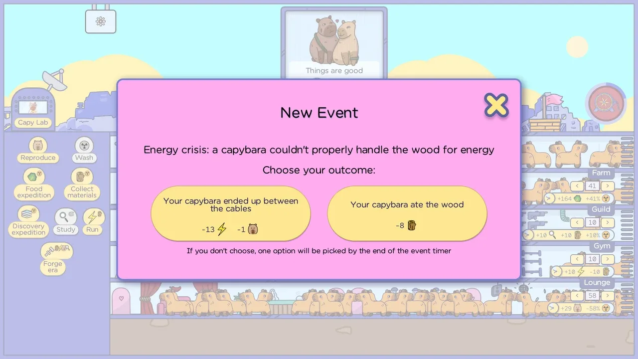 Help Capyshan and Capymay rebuild the Capyvarias empire. Everything is gone. Only these two brave capybaras remain, determined to raise their community from the ashes. Can you click your way to survival, growth, and a future among the stars?
