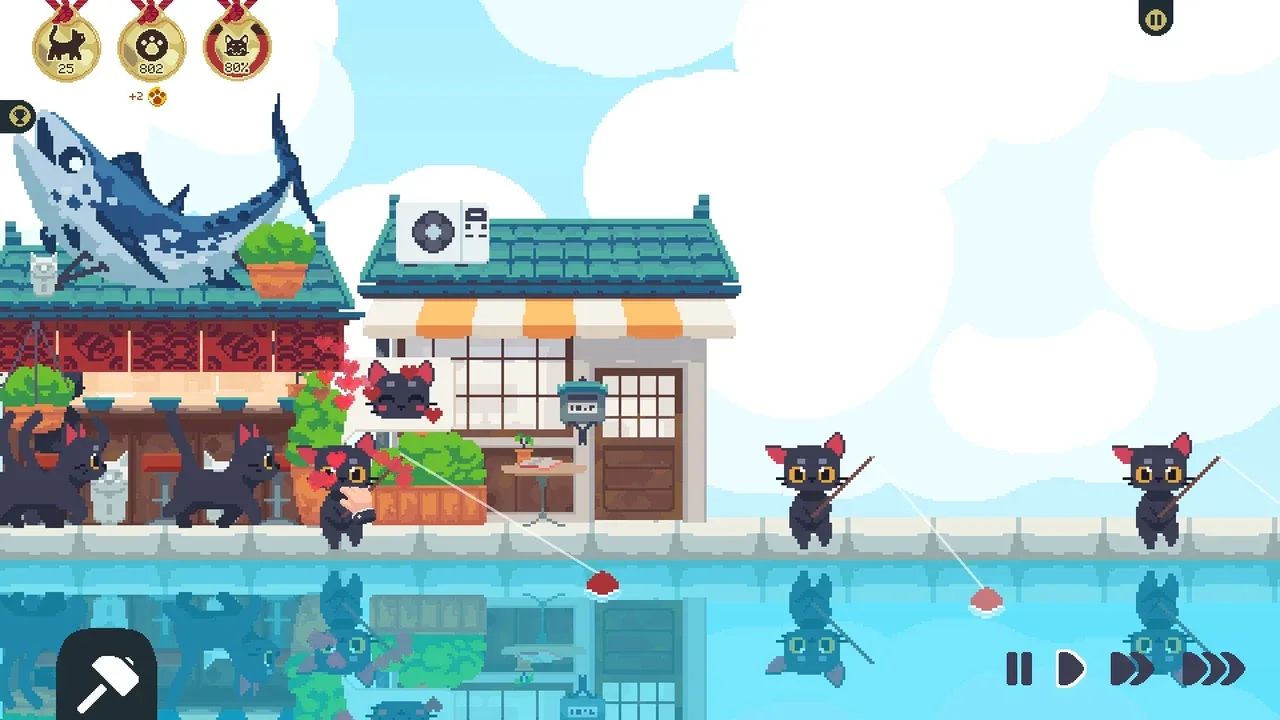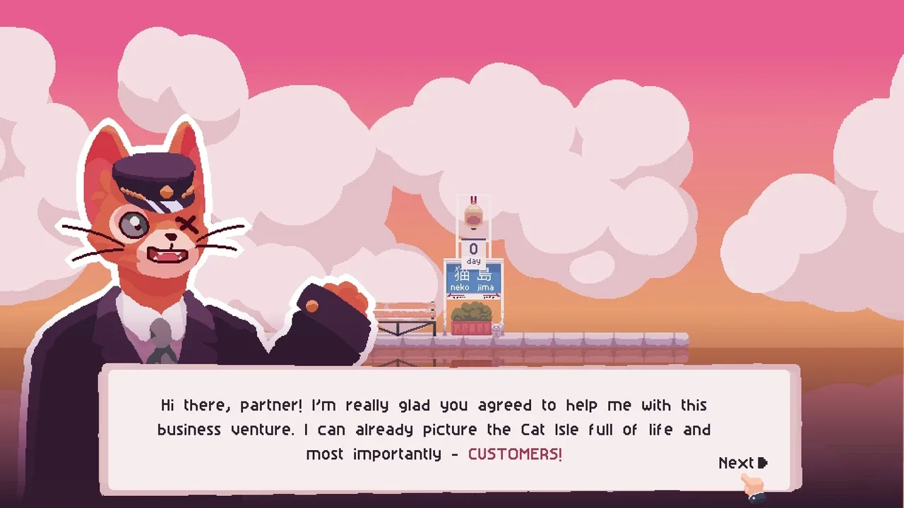 Cat Isle es un acogedor juego de gestión pixel art inspirado en las famosas Cat Islands de Japón. Mezcla ligeros elementos de gestión con un fuerte enfoque en la atmósfera y la expresión del jugador. Aunque gestionar los distintos tipos de suministros de las tiendas y comprender las preferencias de los gatos forma parte de la experiencia, el juego se centra más en una jugabilidad relajante, pescar, interactuar con los gatos, decorar edificios y simplemente observar el mundo que creas. Los jugadores pueden desbloquear decoraciones a través de una máquina Gashapon y personalizar las tiendas y el entorno para dar forma al aspecto de la isla. A medida que construyes y decoras, la isla se transforma lentamente en un espacio acogedor lleno de simpáticos gatos.