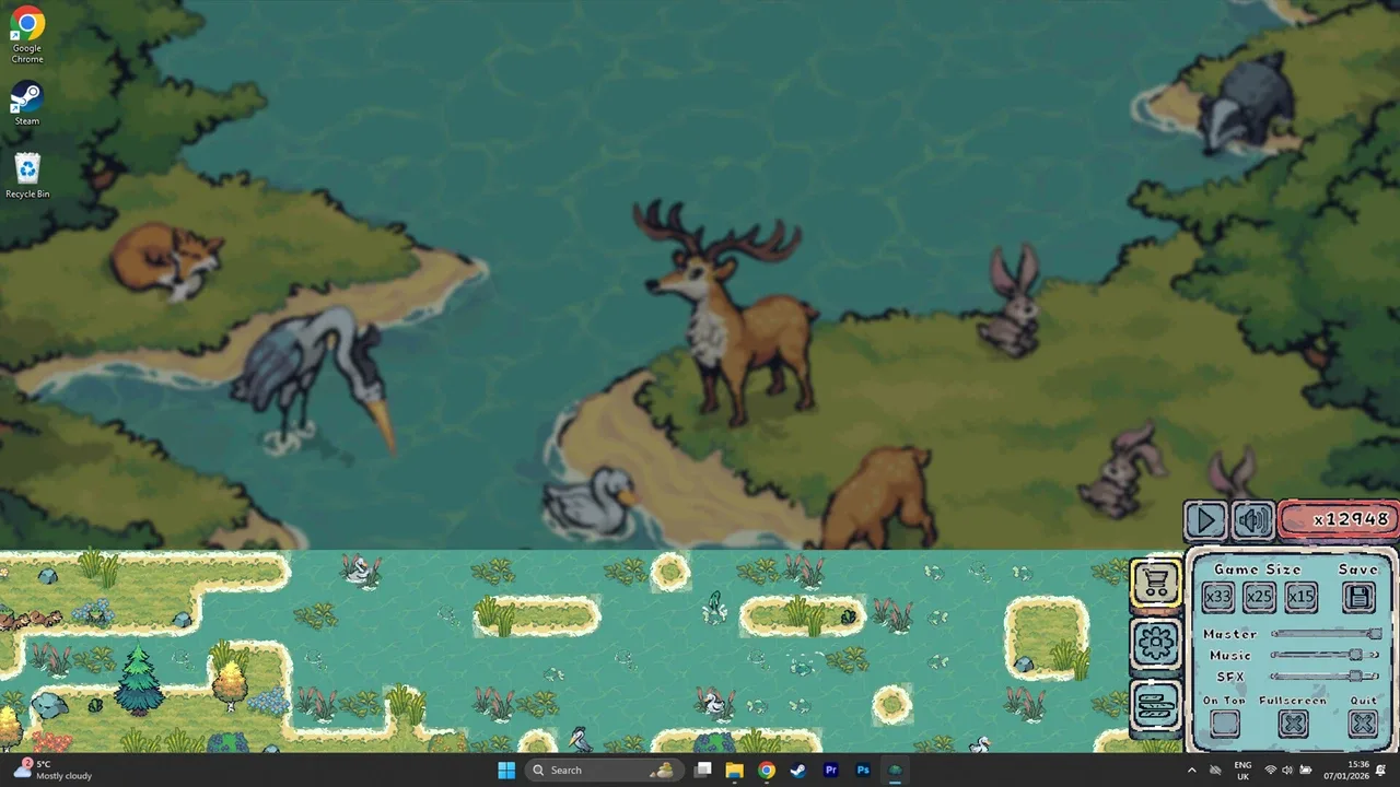 A gentle idle game with a living stream flowing quietly at the bottom of your screen. Terraform the land and watch as animals arrive to make Cozywood their home. Cultivate the surrounding area and bring this cozy ecosystem to life.