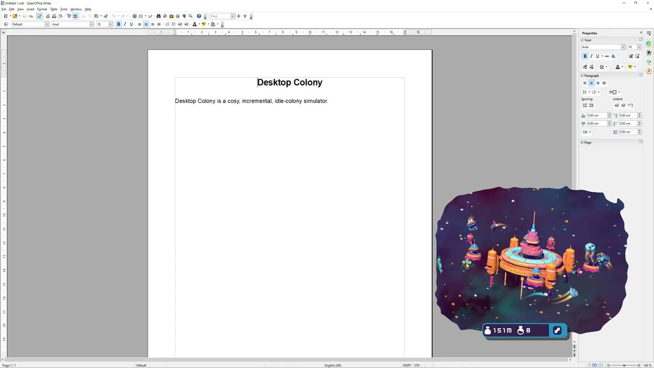 Un acogedor juego incremental de gestión de colonias espaciales que se queda en tu escritorio mientras haces otras cosas. Extrae asteroides, construye naves, expande la colonia, investiga tecnología, descubre misterios y explora el universo.