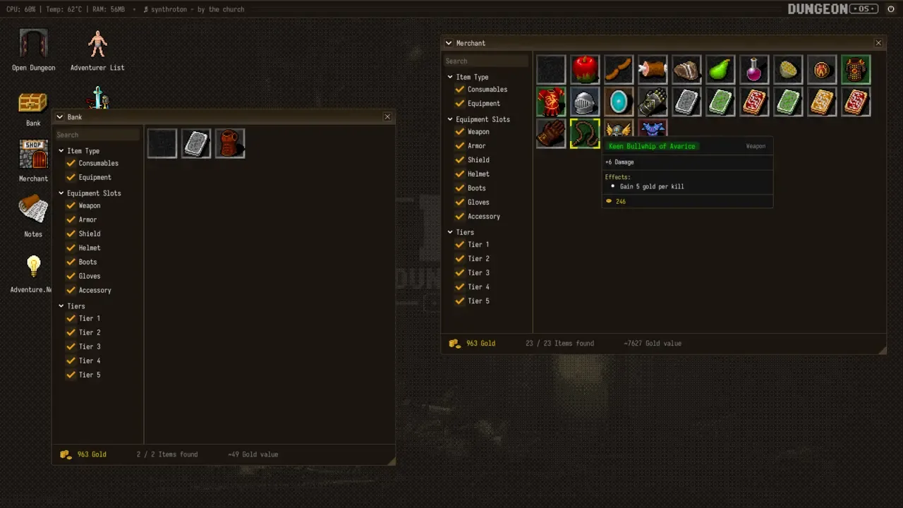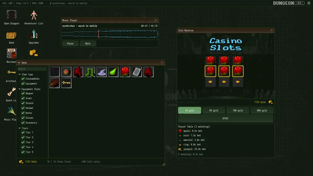 ¡Rastrea mazmorras, saquea y equipa a tus aventureros! Entra en un sistema operativo de la vieja escuela. Gestiona a tus aventureros y utiliza puzles para dañar a tus enemigos. ¿Estás preparado para encontrar los cinco artefactos con los que siempre soñaste?