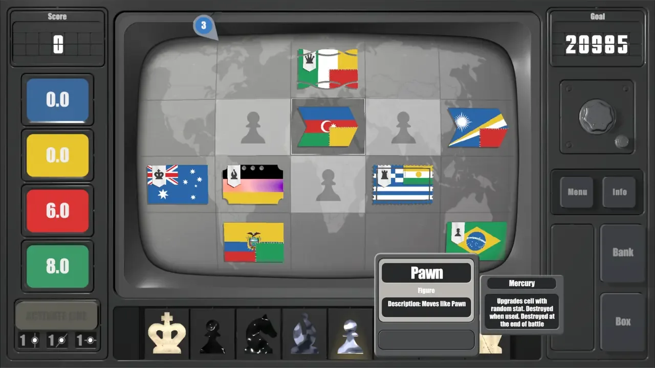 FLAGOTRON es un roguelike constructor de banderas único. Sin cartas, sólo banderas y estrategia. Coloca banderas, muévelas con piezas de ajedrez, construye combos y lucha contra jefes.