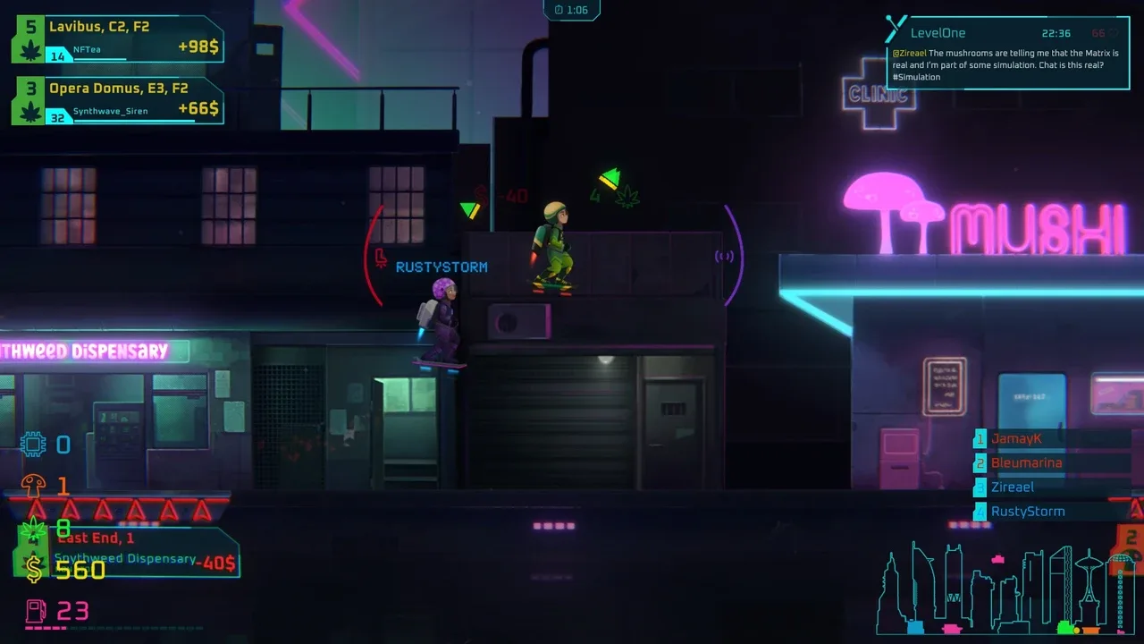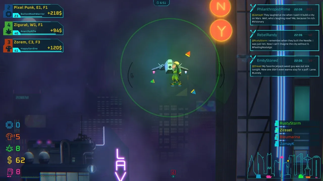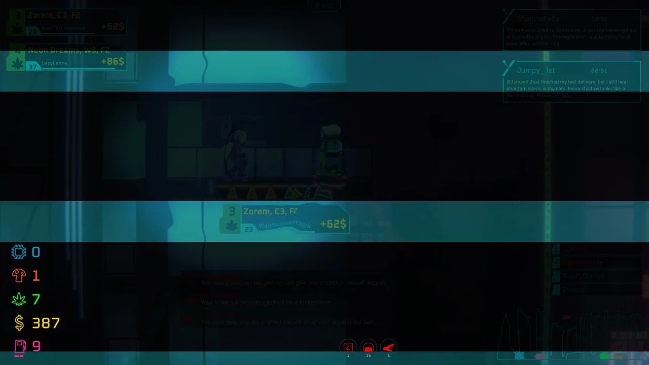 Race against up to five frenemies as jetpack couriers trying to deliver contraband through a pulsing cyberpunk skyline. Master the questionably-engineered flight system, manage fuel & inventory, collect power-ups and EMP blast rivals into cop drones.