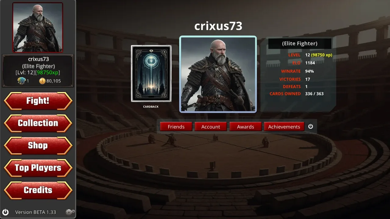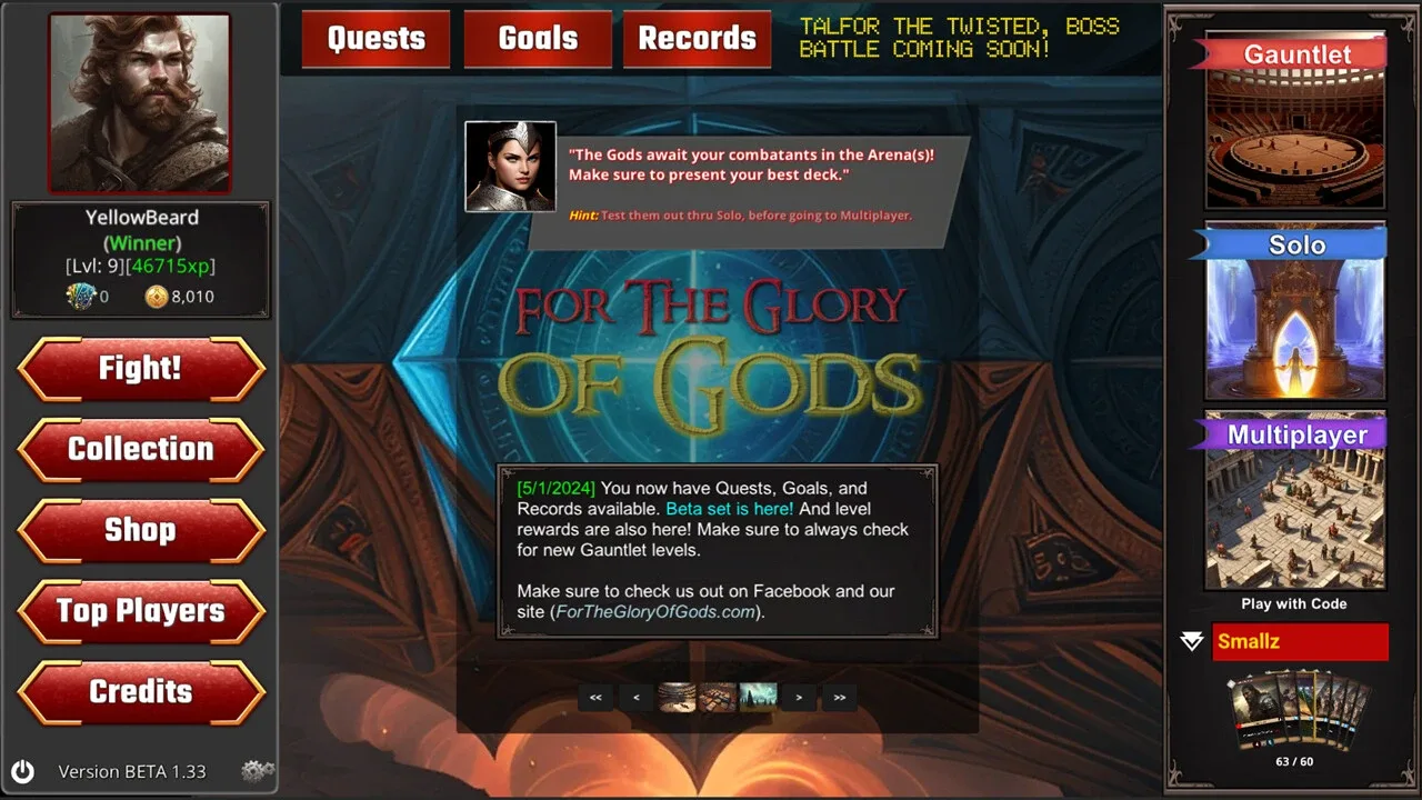Juego alternativo online de cartas coleccionables por turnos, que te permite opciones ilimitadas de construcción de mazos. Tres modos de juego diferentes, incluyendo Solo, Guantelete y Multijugador, ¡para elegir! Gana cartas, mazos y monedas, e intenta mantenerte en lo más alto de las tablas de clasificación Por la Gloria de los Dioses.