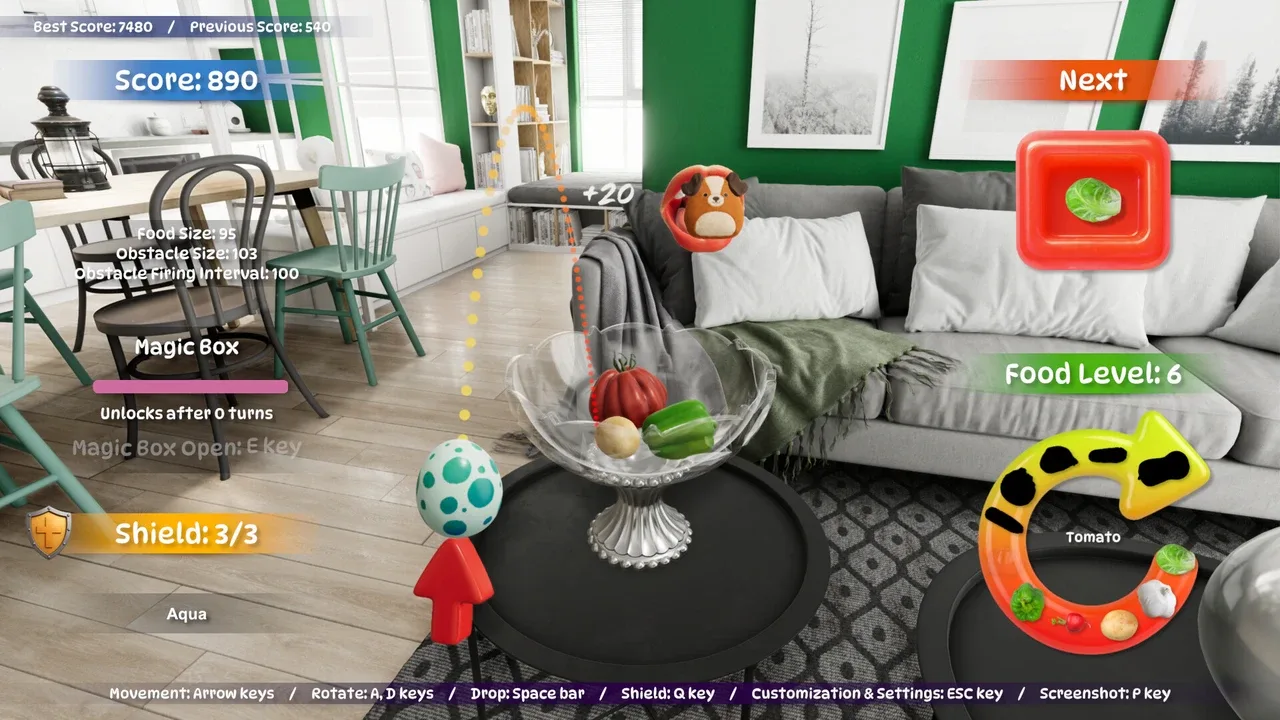 Un juego de rompecabezas de física en 3D en el que esquivas juguetes voladores mientras dejas caer y fusionas alimentos idénticos para crear una variedad de frutas y verduras.