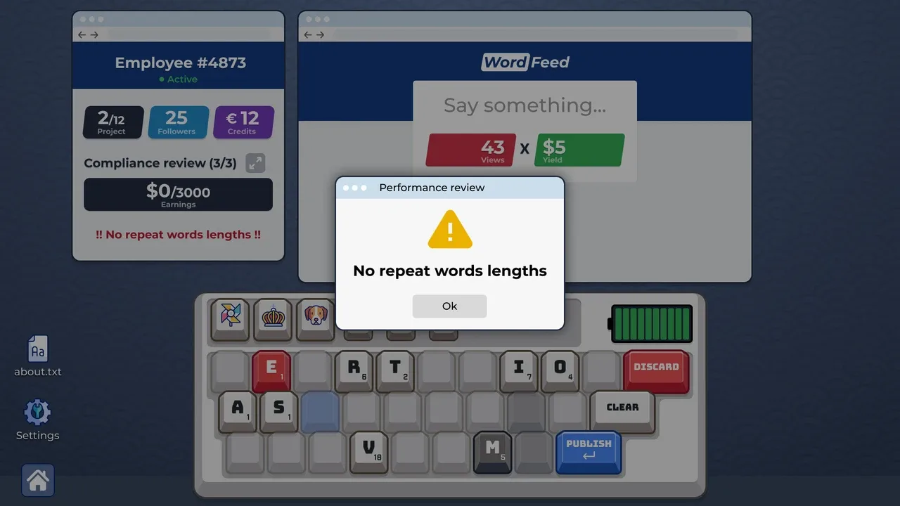 Adorna tu teclado con potentes mejoras en este roguelike de construcción de palabras. Coloca tapas de teclas para pulir filas o columnas enteras, instala teclas de función "rotas" y elige tus proyectos mientras pasas de ser un humilde becario a una leyenda corporativa.