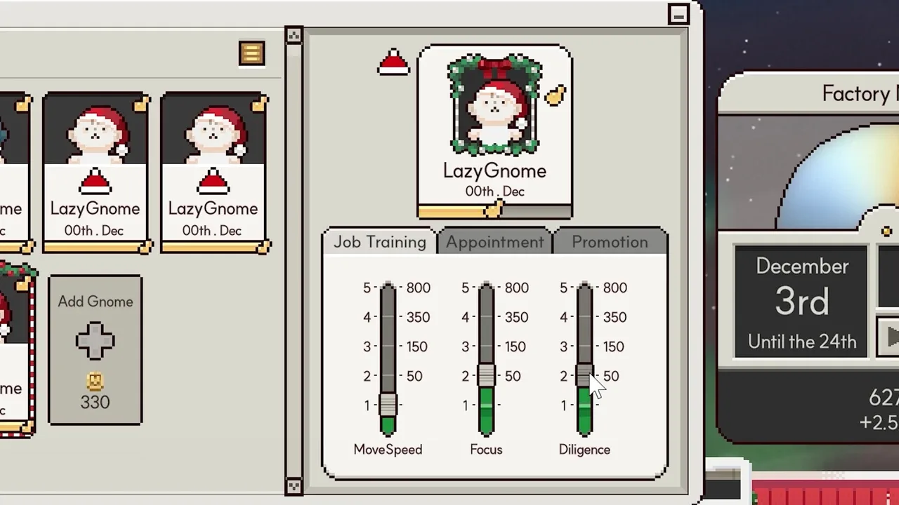 ¡Dirige una caótica fábrica de regalos de Navidad con traviesos gnomos! ¡A trabajar, gnomos! Fábrica de Navidad es un breve juego de gestión en el que preparas regalos para los niños antes de Navidad. Empaqueta regalos, construye líneas de producción, dirige gnomos y asigna tareas para convertir un taller en una fábrica eficiente.