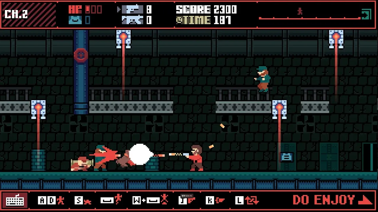 GUN-DOG-REVENGE es un shooter arcade de plataformas de alta velocidad, inspirado en los clásicos de NES "Rolling Thunder" y "Code Name: Viper", el éxito indie "RollingBird" en Steam, y la película "John Wick". ¡Recarga! ¡Dispara! ¡Mata al jefe! Venganza para tu perro.