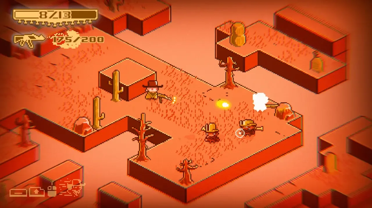 Hellfire Poncho is a western rogue-lite isometric shooter. Shoot little demons with your upgraded weapons, die, and try again stronger. Bet your upgrades against the creatures you meet in the saloon, and develop your best build. Don't push your luck....