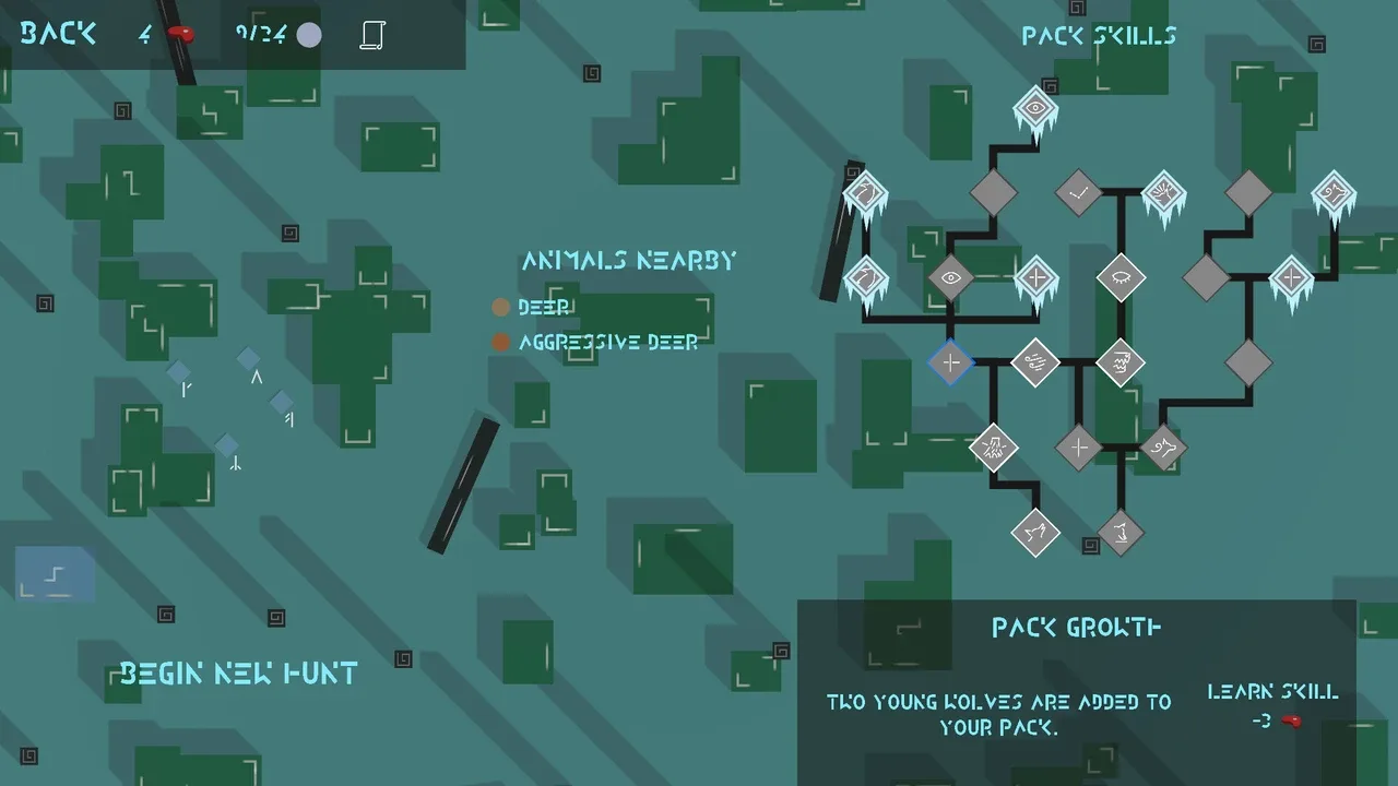 Es un bosque de noche y comienza la caza. Planifica cuidadosamente el siguiente movimiento de tu manada para evitar ser visto, olido u oído. Caza suficientes presas para sobrevivir el mes siguiente, y desarrolla tu manada y tus tácticas a lo largo de las estaciones cambiantes. Fracasarás, ¡pero aprende de tus errores y prepárate para la próxima cacería!