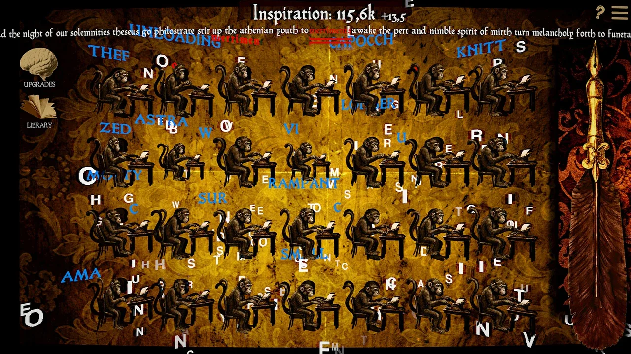 **Teorema del Mono Ocioso** es un encantador juego ocioso/de clics que da vida al famoso *Teorema del Mono Infinito*. Observa cómo tu adorable equipo de monos teclea frenéticamente en sus máquinas de escribir, produciendo aleatoriamente palabras que, contra todo pronóstico, recrean lenta pero inexorablemente las obras completas de William Shakespeare.
