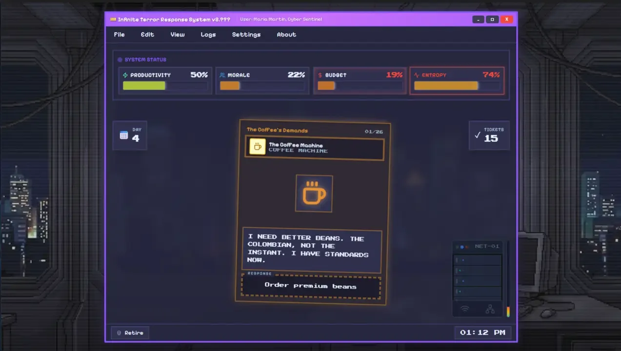 La impresora está sangrando, el Wi-Fi está embrujado y acaba de llegar el Ticket nº 666. Como último empleado de una empresa dirigida por horrores cósmicos, tu trabajo es sencillo: Pasa el dedo para sobrevivir. Toma decisiones binarias para sobrevivir al turno de noche en este simulador de escritorio de comedia oscura. La informática no se acaba nunca.