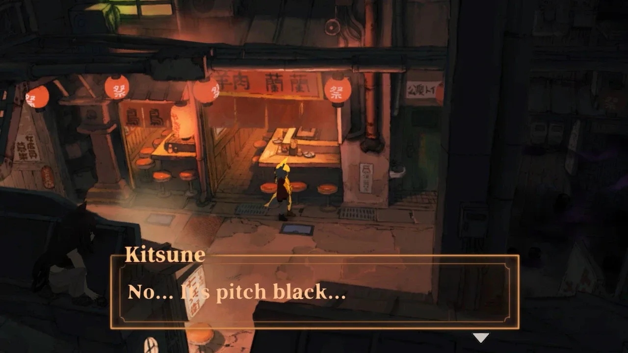 "Where will their light lead them?" Kitsune is a fox girl who finds herself on Adashino Island and starts travelling with her Frog friend. Neon signs give light and color to the island with a Japanese-inspired atmosphere. Something is lurking in the shadows, inching ever closer...