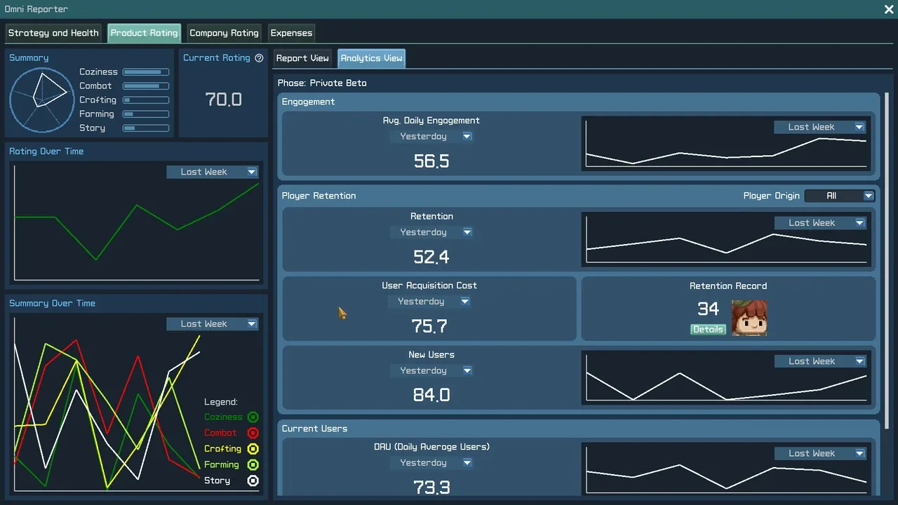 Dirige un estudio de juegos que crea el mayor MMORPG del mundo. Contrata diseñadores, programadores y probadores, crea un mundo de fantasía y da la bienvenida a cientos de jugadores virtuales. Si se aburren, cancelarán su suscripción y tus inversores tendrán tu cabeza. Incluso podrás jugar al juego que crees.