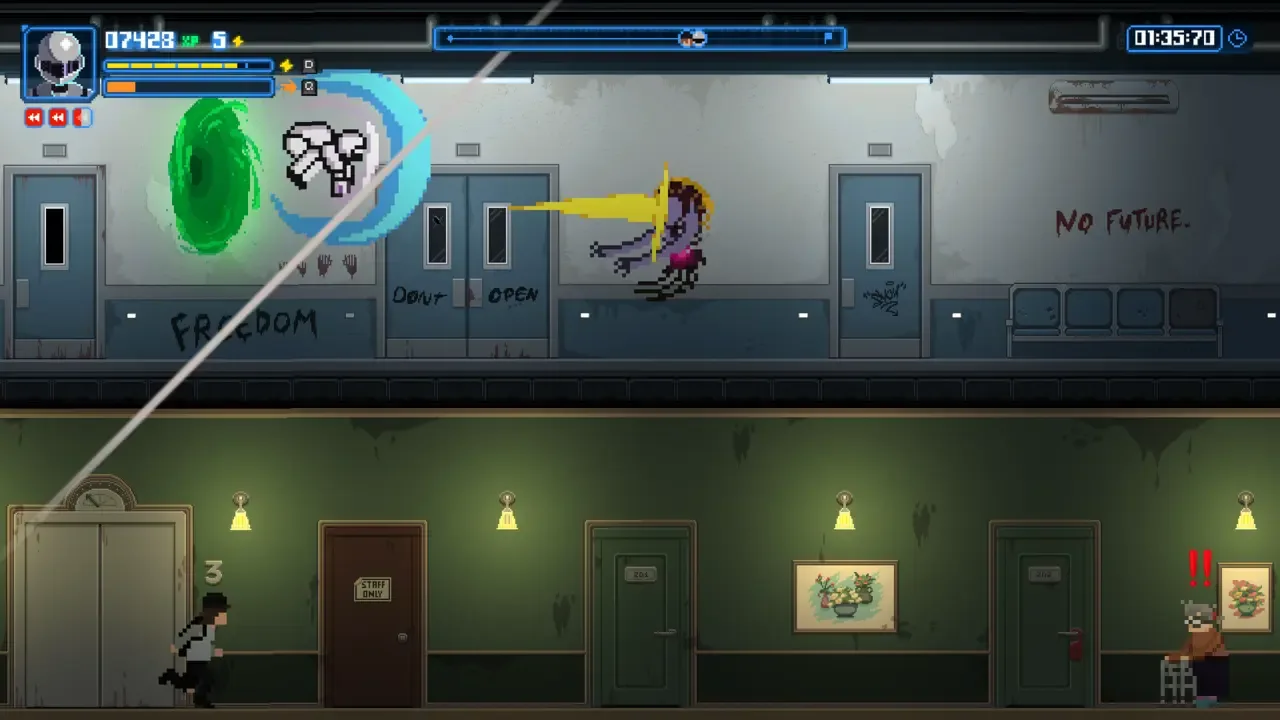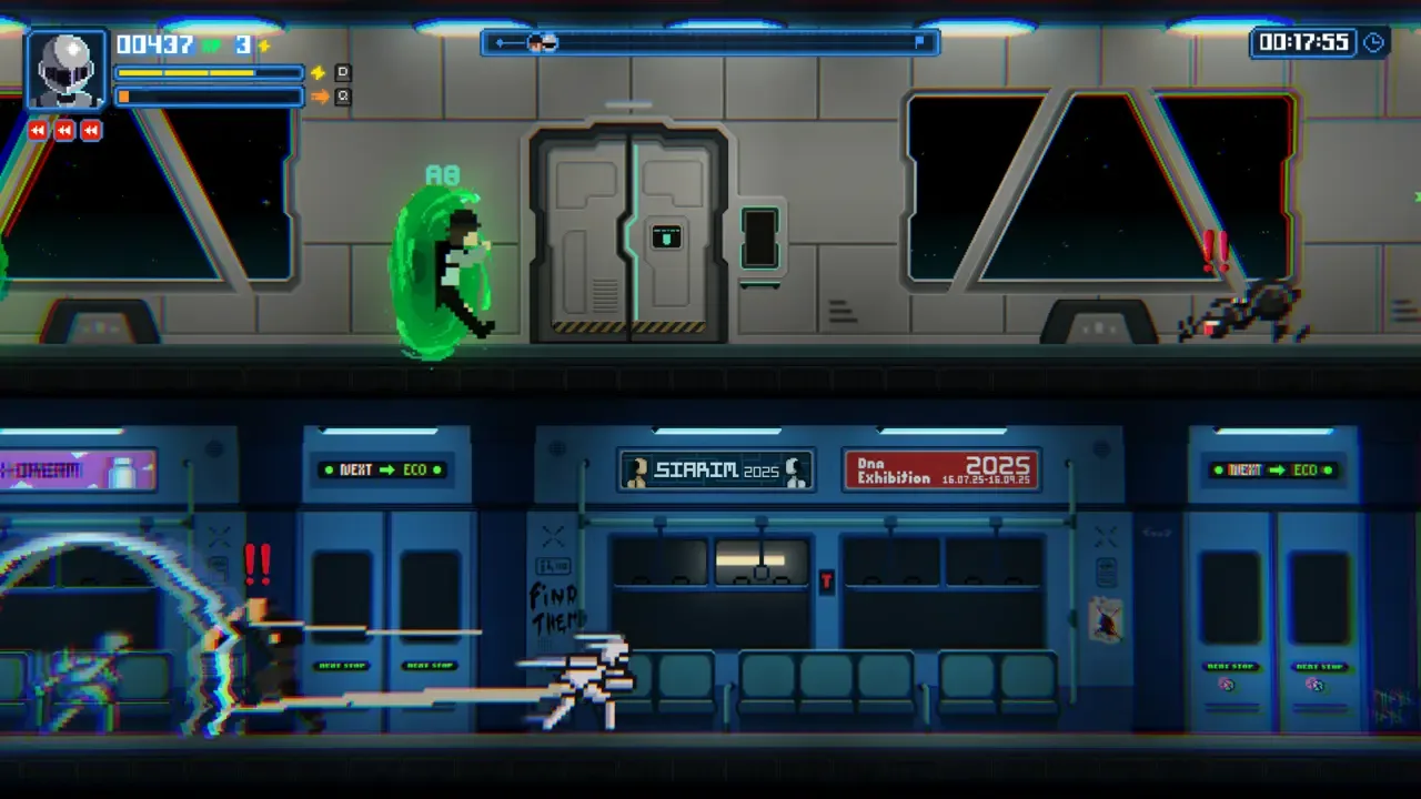 Embárcate en una frenética aventura en la lucha por la humanidad. En este innovador runner 2D pixel-art, en el que un jugador controla a dos personajes en la misma pantalla, explora el tiempo y sus ramificaciones. ¡Juega una excelente historia, mejora tus personajes, bate récords y derrota a tus enemigos!