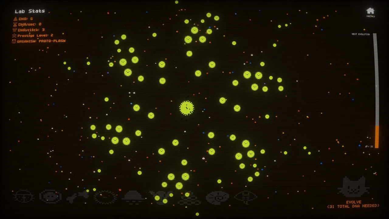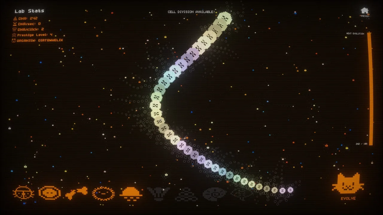 Mytosis es un juego incremental corto y experimental sobre la evolución de formas de vida, desde células simples hasta organismos procedimentales complejos.