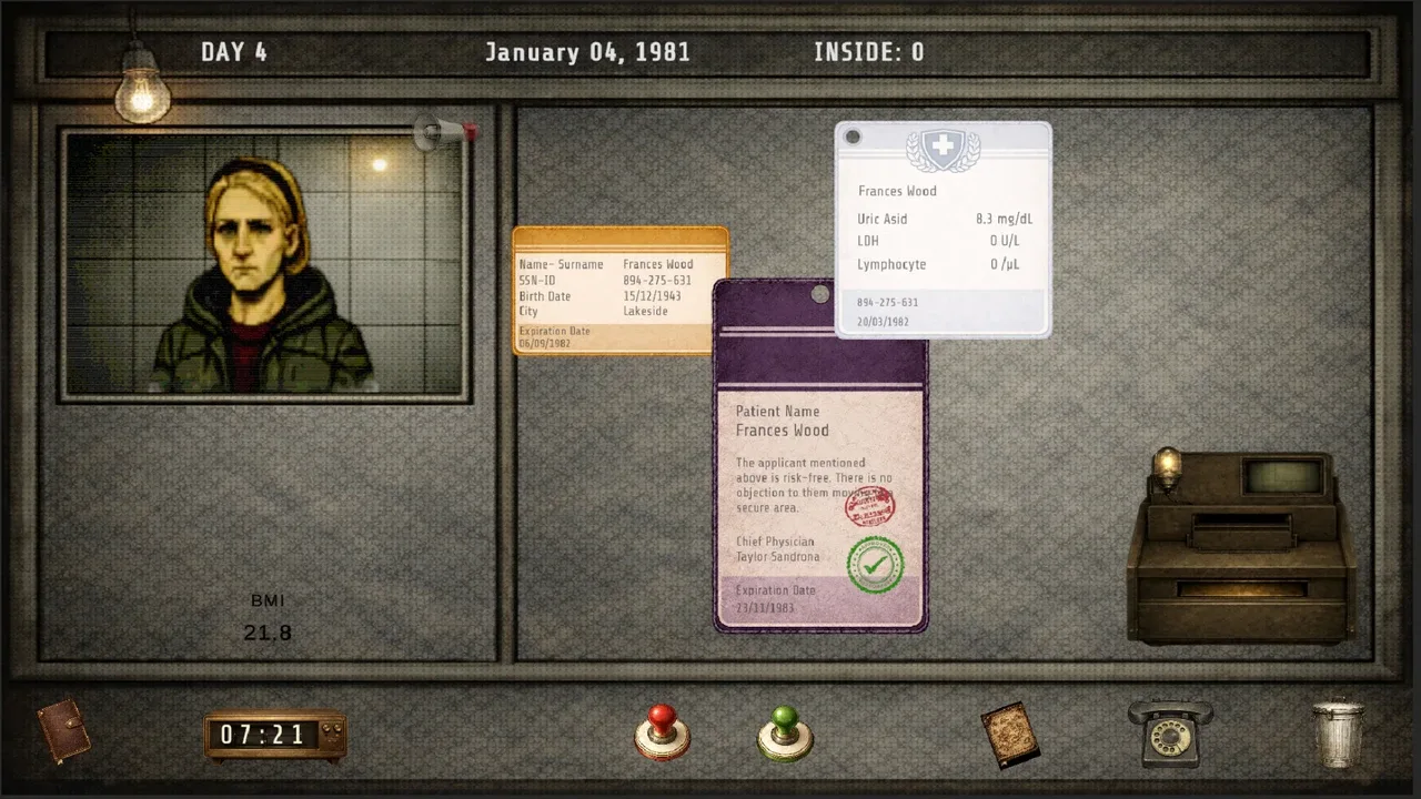 Durante una pandemia, eres funcionario de distribución médica en un puesto de control controlado. Revisa las identificaciones, los informes médicos y los análisis de sangre; aprueba o deniega las solicitudes. Los suministros son limitados. Los procedimientos son estrictos. La decisión es tuya.