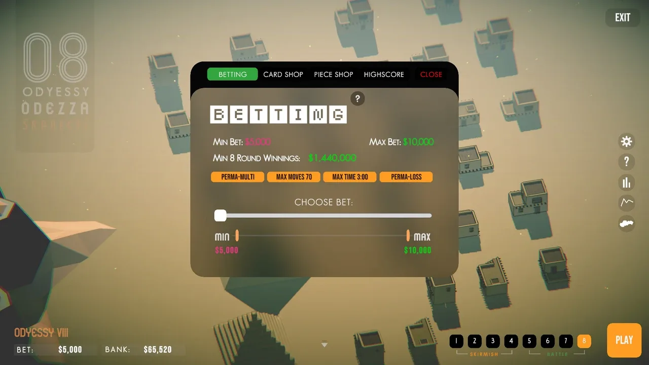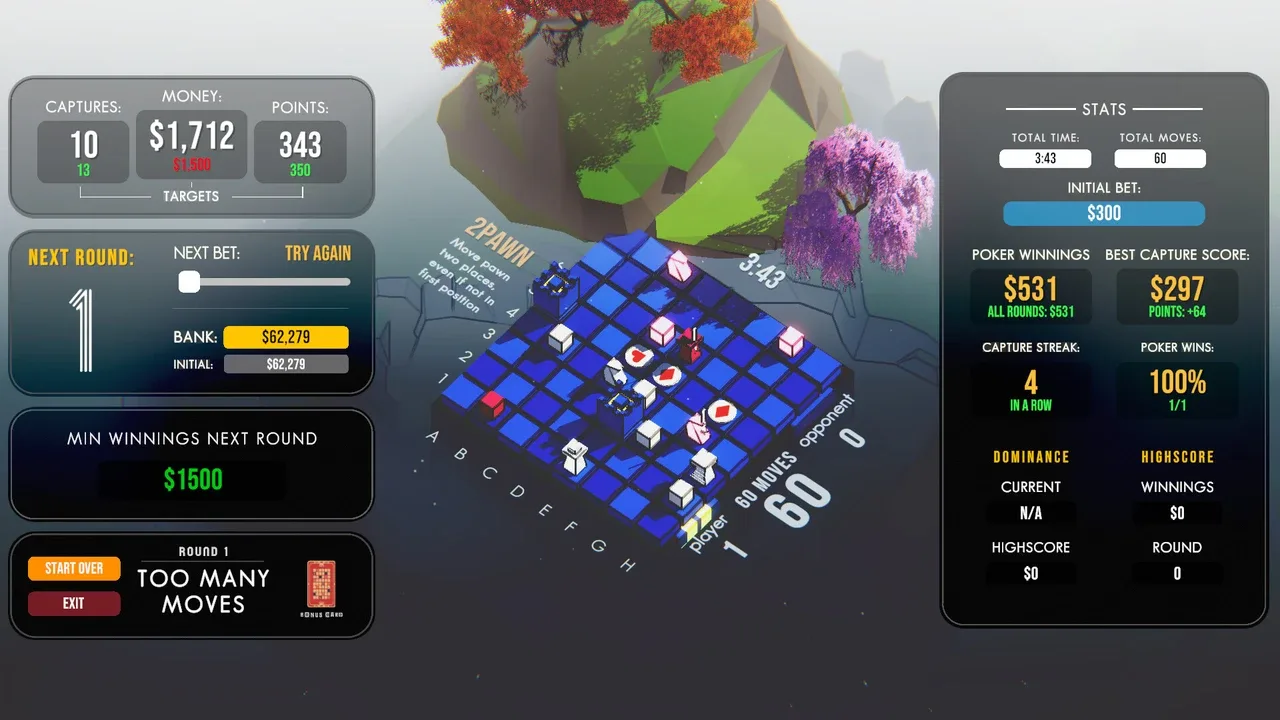 El ajedrez se encuentra con el póquer. Un juego de altas apuestas donde las batallas de ajedrez y las manos de póquer deciden tu destino. Captura piezas, construye manos y apuesta tu camino a través de las Odiseas.