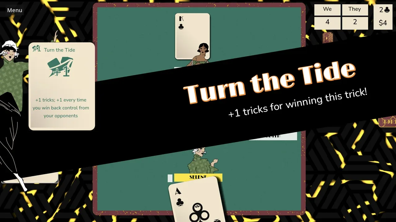 ¡Un roguelike de hacer trucos con estilo! Supera a tus rivales, adquiere habilidades especiales y deslumbra a la alta sociedad de los años 20 con tu imparable juego de cartas. Pide tu contrato, sigue el juego, tira las bazas y gana la mano. Esto no es el club de bridge de tu abuela... ¡esto es Overtrick!