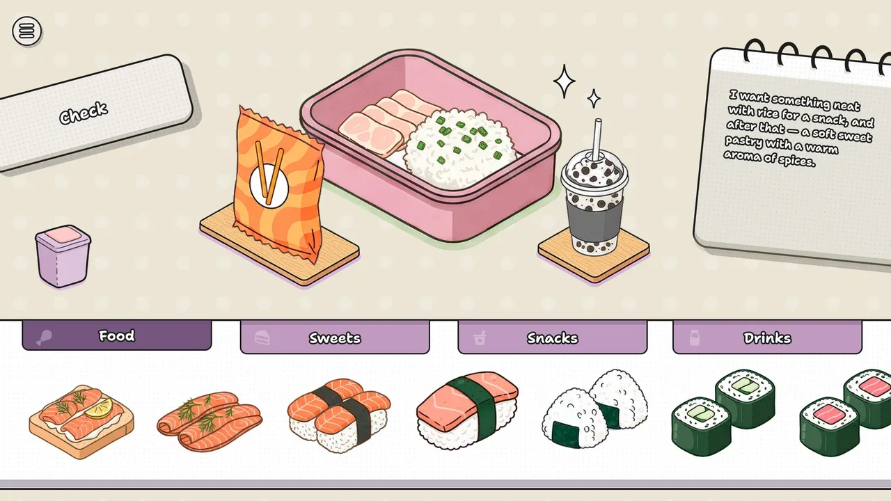 Pack my LunchBox es un simpático y relajante juego de puzzle en el que montas fiambreras basándote en los deseos de los clientes. Lee las tarjetas, ten en cuenta lo que les gusta y lo que no, y elige la comida, la bebida y el tentempié perfectos. ¡Cumple todas las condiciones para superar el nivel!