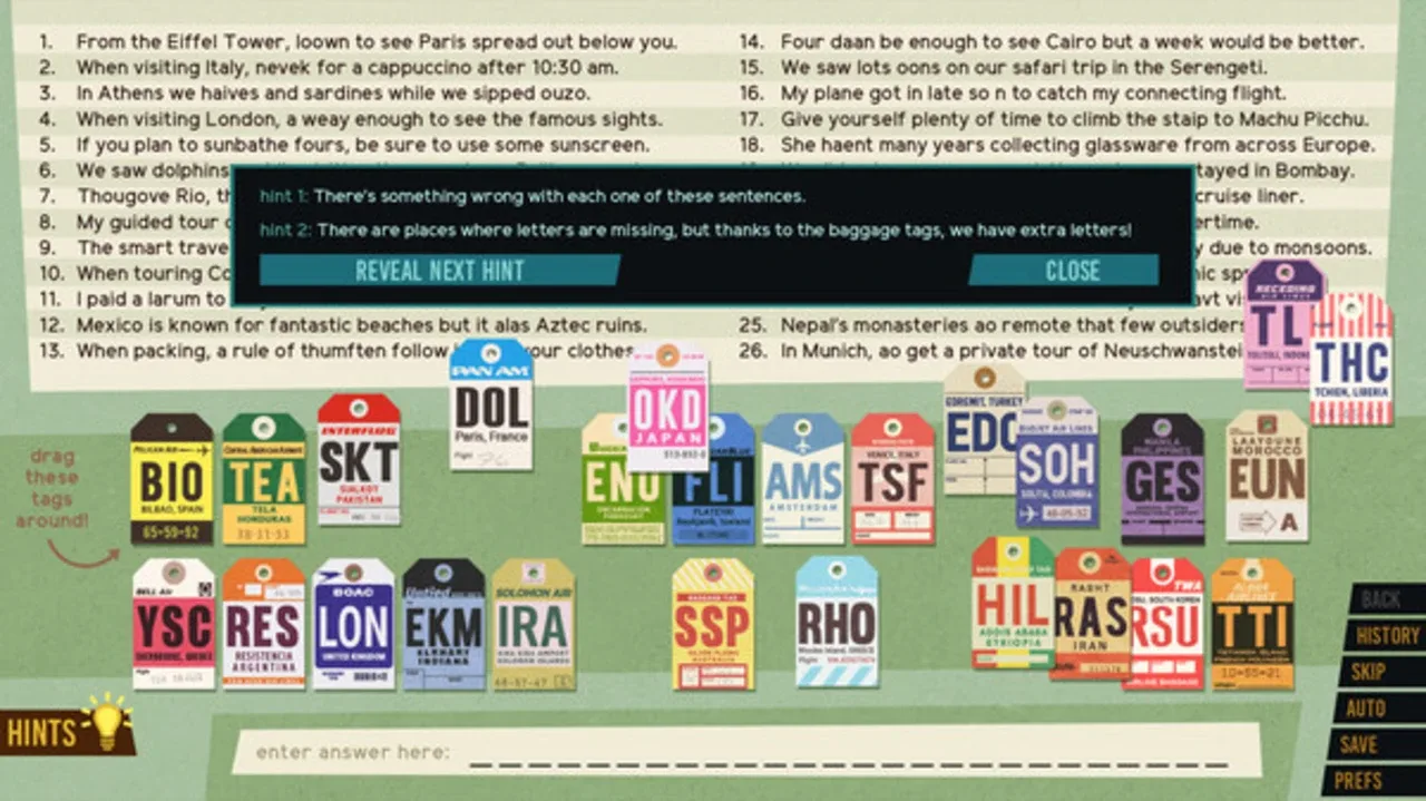 Persigue a una banda de ladrones de diamantes y su rastro de enigmas crípticos en esta aventura de espionaje de los años 60. Como Agente Epsilon, elegirás tu camino mientras charlas con (¡o chateas!) contactos sospechosos. ¡Descifra criptogramas, descifra pistas y deduce respuestas mientras resuelves juegos de palabras y puzles de lógica por todo el mundo!
