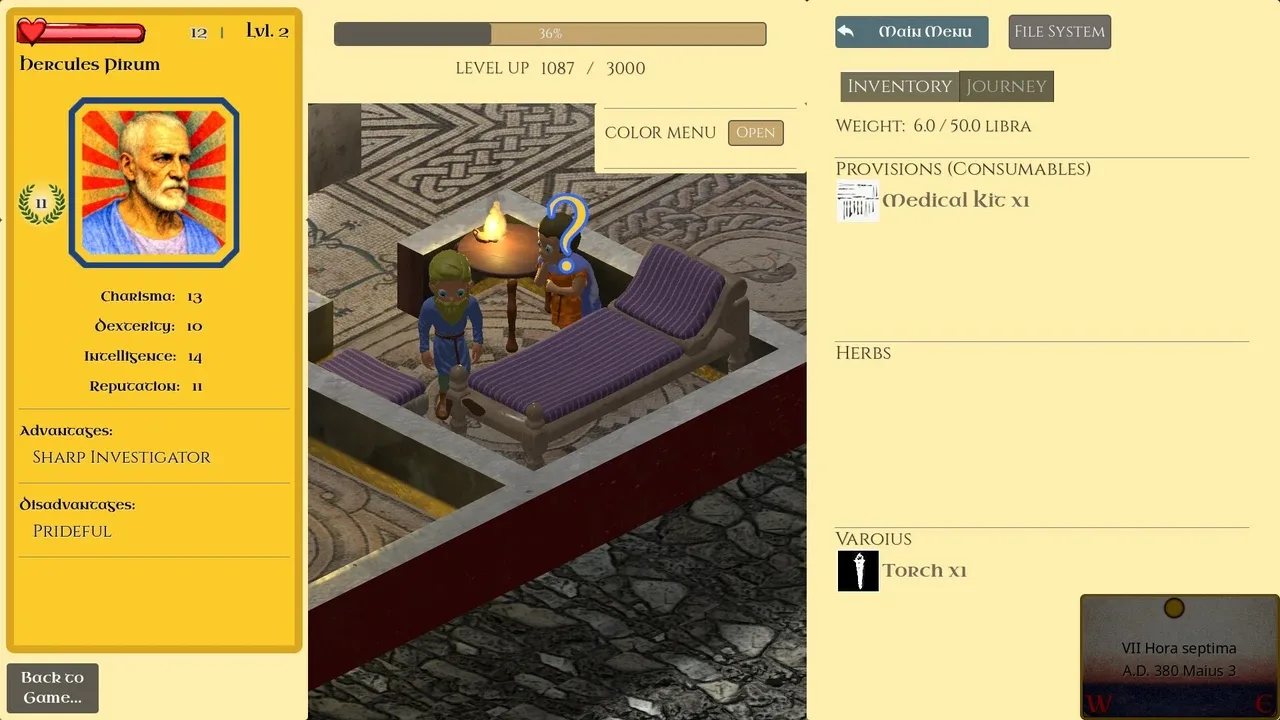 Rod of Asclepius is a historical RPG in 4th-century Pannonia. Play a Roman medicus: investigate symptoms, gather herbs, and perform turn-based treatments. Explore researched sites and make ethical choices that shape your reputation as the empire falters.