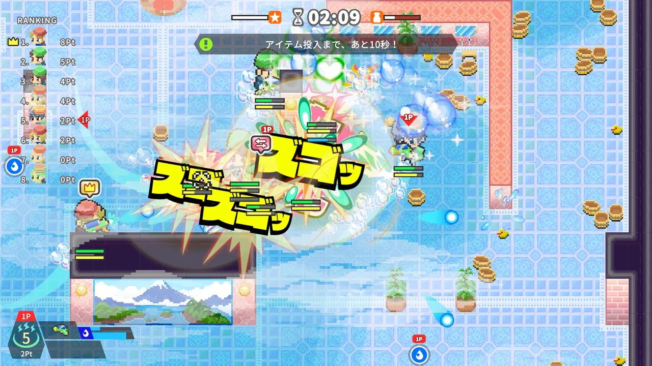 Slide, Shoot, and Send Your Rivals Flying!Chaotic, tumbling shooter battle set in a Japanese Sento (public bathhouse). On these super slippery floors, you'll slide, shoot, and stumble to victory. Defeat your rivals and soak in the sublime bath reserved only for the winner!
