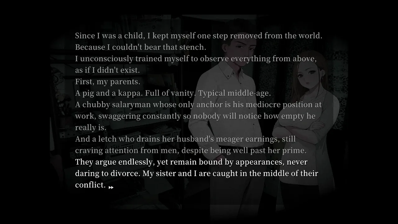 Una oscura novela visual creada por el equipo que creó NEEDY GIRL OVERDOSE. Excesivamente sensible a las emociones de los demás, el protagonista -un escritor de novelas ligeras- desarrolla la capacidad de leer la mente, sólo para hundirse aún más en el aislamiento. El único consuelo que le queda es su hermana pequeña, dotada pero solitaria.