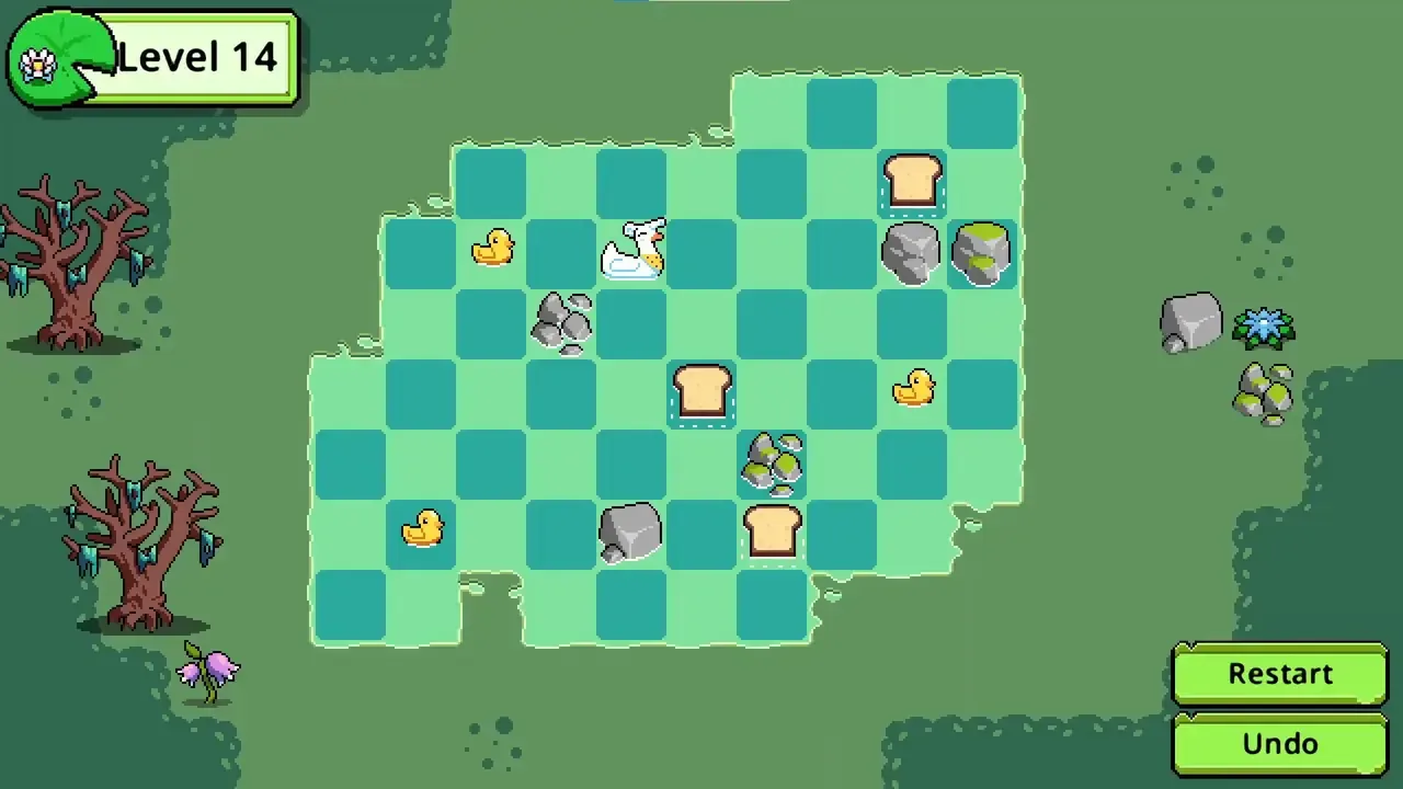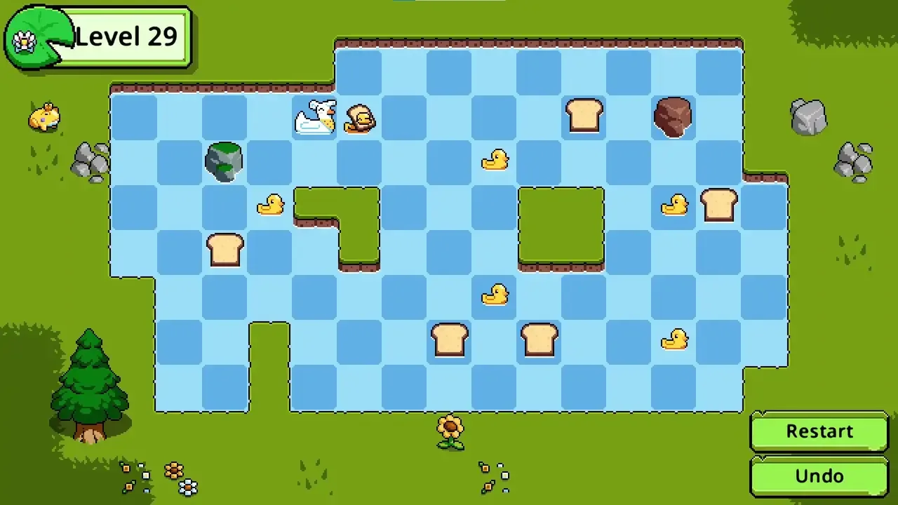 The goal is to guide all the ducklings to eat the scattered bread in each level. The game focuses on logical challenges and progressive difficulty across two distinct maps to keep players engaged.