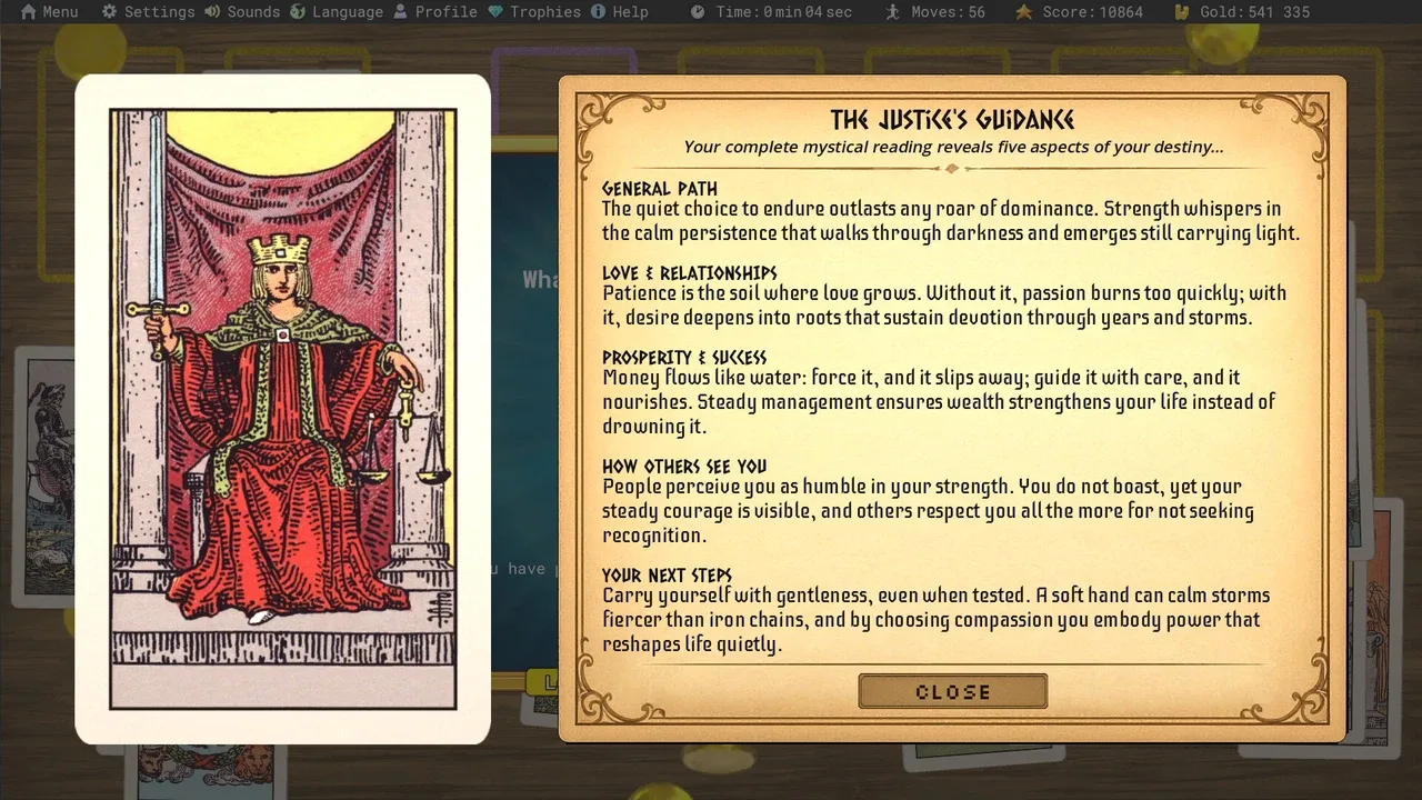 Experimenta el solitario Klondike a través de las cartas clásicas del Tarot. Gana oro, reclama tesoros, desbloquea cartas de los Arcanos Mayores y si ganas... que te digan la buenaventura.