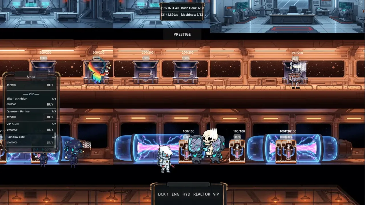 ¡Gestiona la cafetería de una bulliciosa estación espacial en este juego de ciencia ficción! Contrata a extravagantes baristas alienígenas, automatiza tu imperio del café en 5 cubiertas únicas y sobrevive a los caóticos eventos de la Hora punta para obtener enormes recompensas. Consigue prestigio para desbloquear potentes mejoras permanentes.