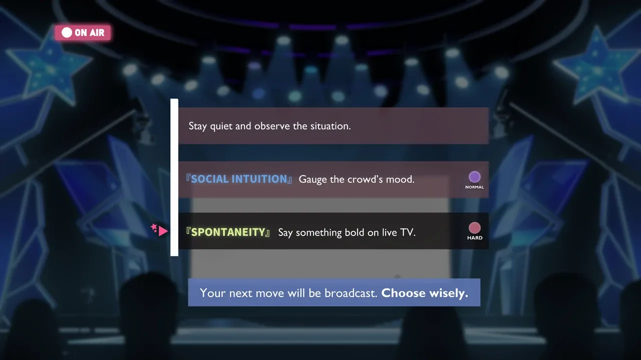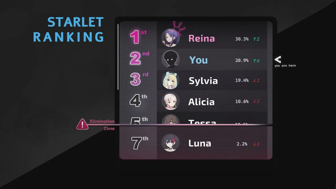 STARLET☆VOICE es un simulador narrativo de supervivencia en un concurso de talentos televisado de 100 días de duración. Entrena tus habilidades, construye tu personaje, gestiona la presión y forma relaciones mientras atraviesas episodios semanales condicionados por tus decisiones. La opinión pública, las reacciones de los fans y los riesgos en directo determinan si asciendes en la clasificación o caes en la zona de eliminación.