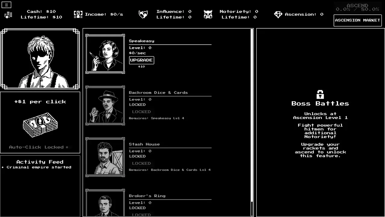 A casual, story-driven incremental game set in 1920s New York. Build your criminal empire from speakeasies to protection rackets, fight rival hitmen, meet colorful characters, and become the city's most powerful crime lord.