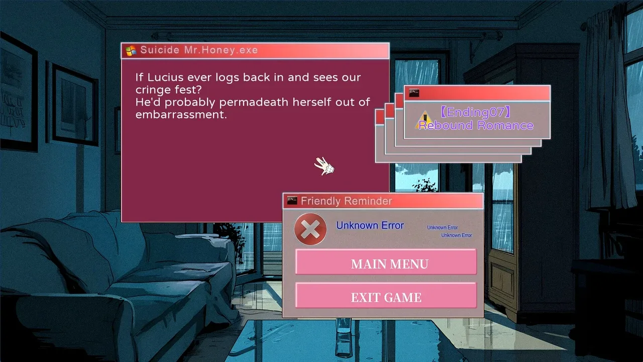 Suicida Sr. Furia es una aventura Meta-Otome que deconstruye lo absurdo de enamorarse de alguien que no existe. Navega por caminos ramificados, metanarrativas y un multiverso de locura con el prepotente director general, Mr. Fury, entre el delirio digital y la cruda realidad.