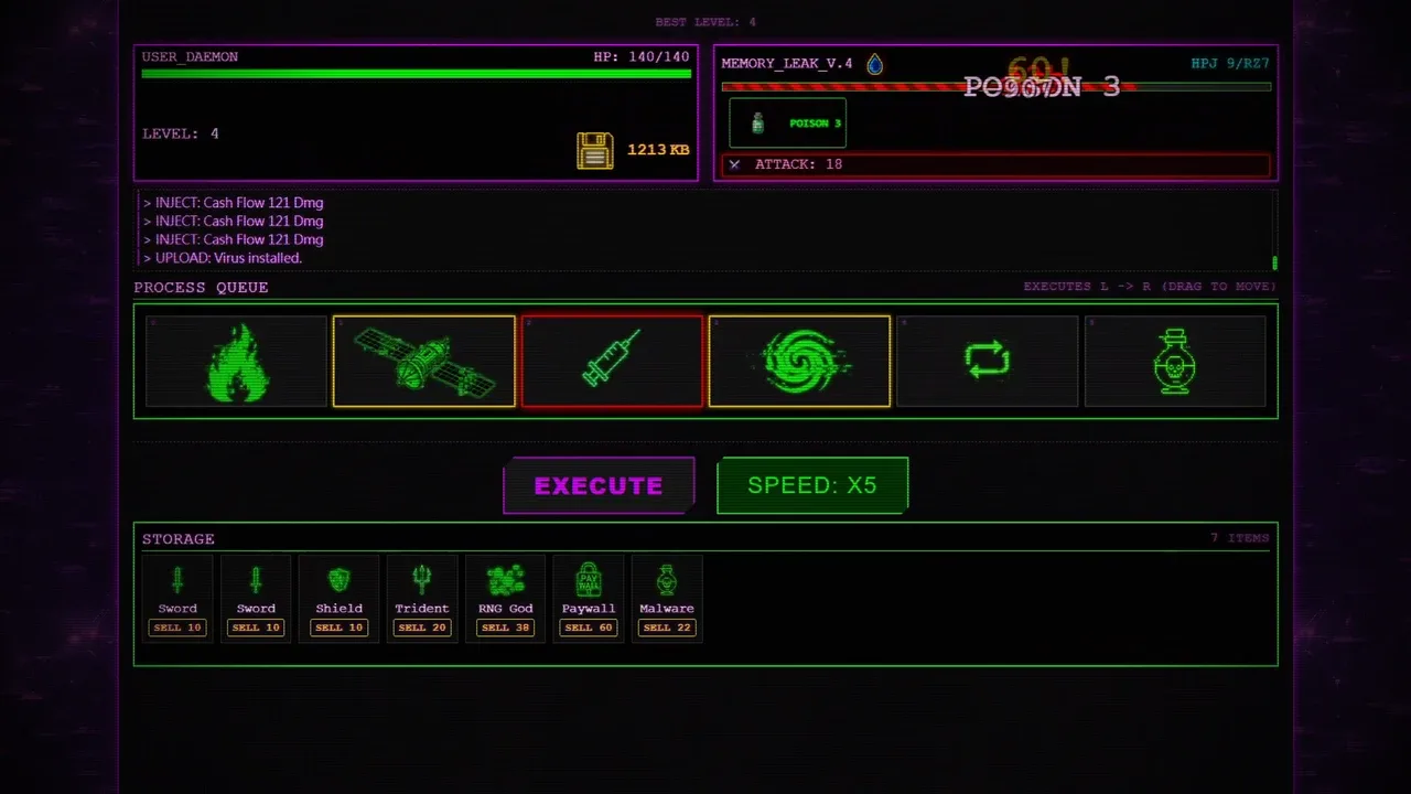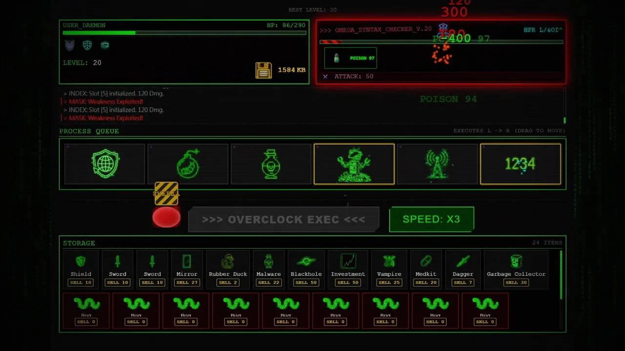 Compila. Ejecutar. Sobrecarga. Un roguelite estratégico donde la Sintaxis lo es Todo. Arrastra y suelta módulos para optimizar tu cola de ejecución, instala software .EXE para romper las reglas y enfréntate a virus legendarios como ILOVEYOU y WannaCry. ¿Puedes colapsar el sistema y escapar?