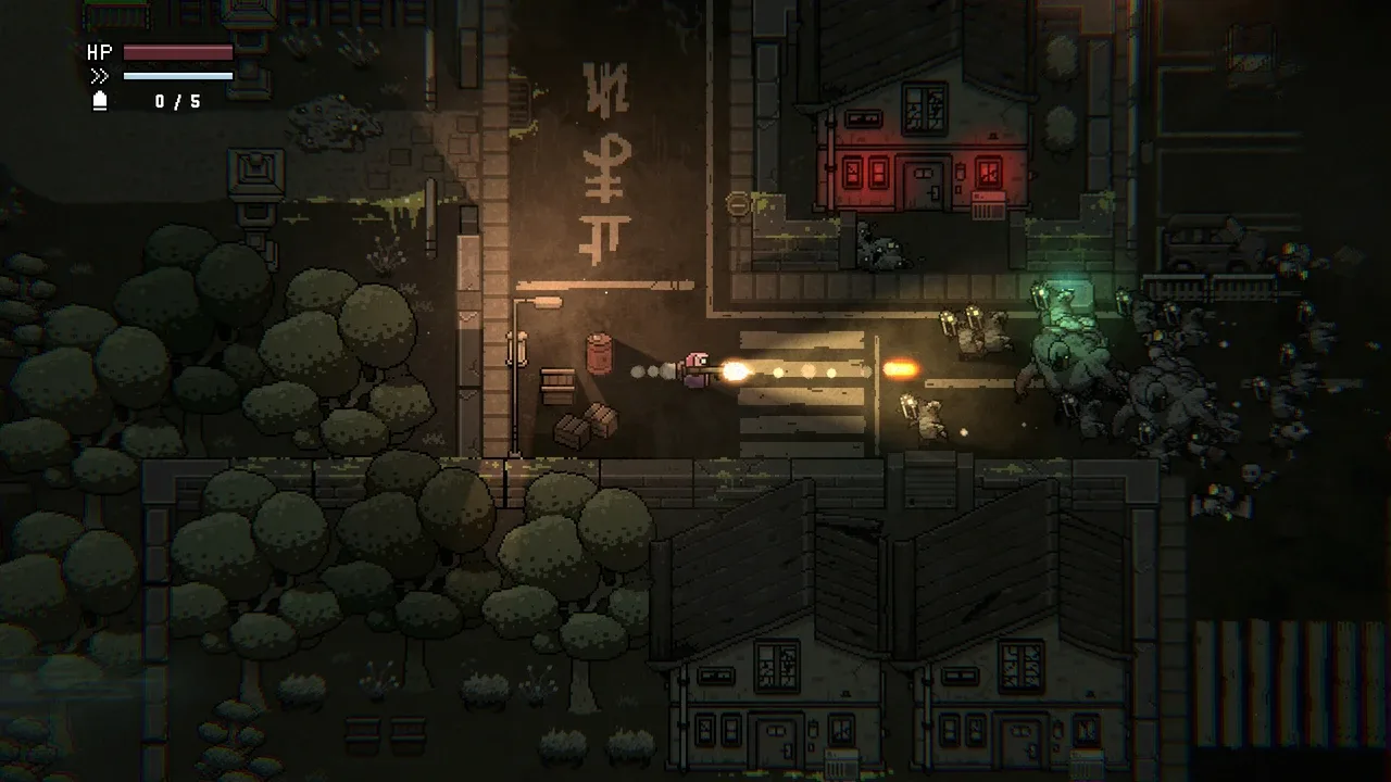 Esperanza de Vida Terrible es un shooter roguelite de arriba abajo con elementos de Supervivientes, en el que luchas contra absurdas hordas de mutantes para diversión de un público sanguinario invisible. Sólo heredas todas tus mejoras mientras alguien de tu familia siga respirando... o al menos crispándose.