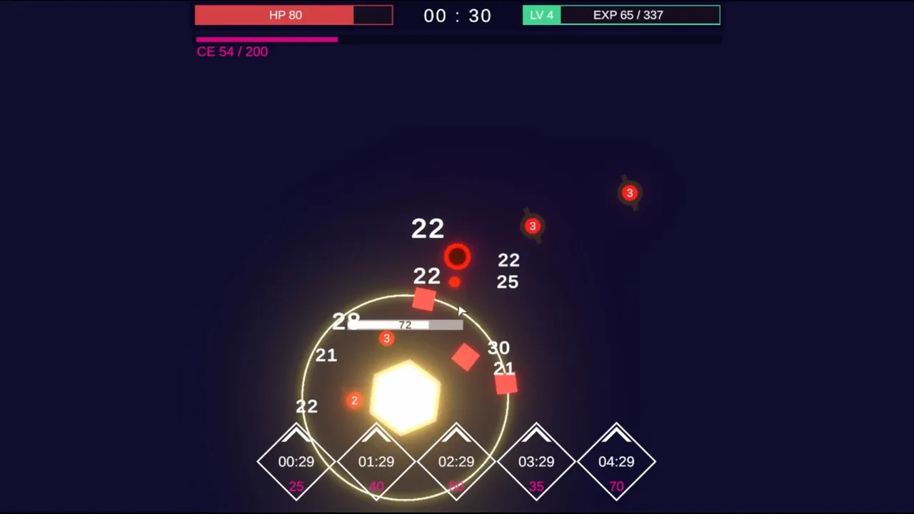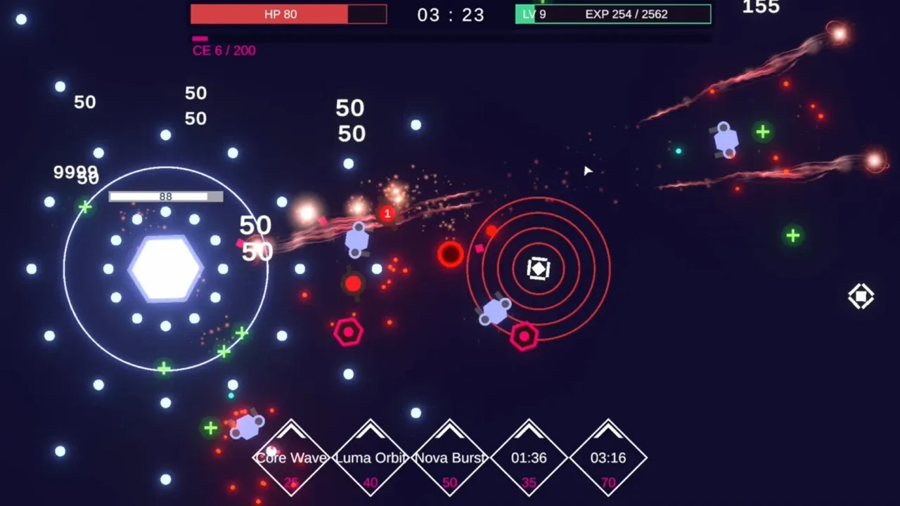 "Un shooter de acción hiperroguelike en el que esquivas interminables oleadas de enemigos, evolucionas y luchas para llegar al Núcleo"