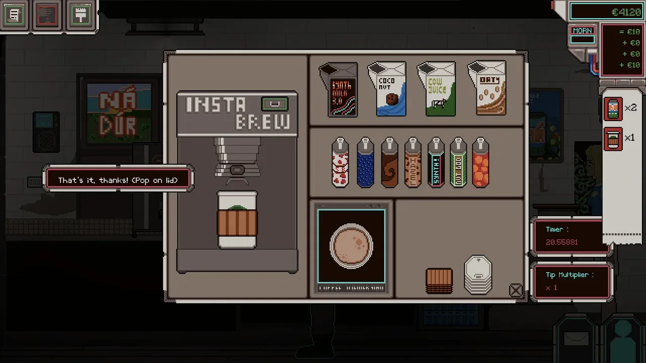 The Corner Cafe is a cozy(ish) cafe simulator set in a retro futuristic mythical Ireland in the year 2160. Play as Dan, the new owner of The Corner Cafe, the last independent cafe in Galway City. It is up to you to create an oasis of community in this dystopia...