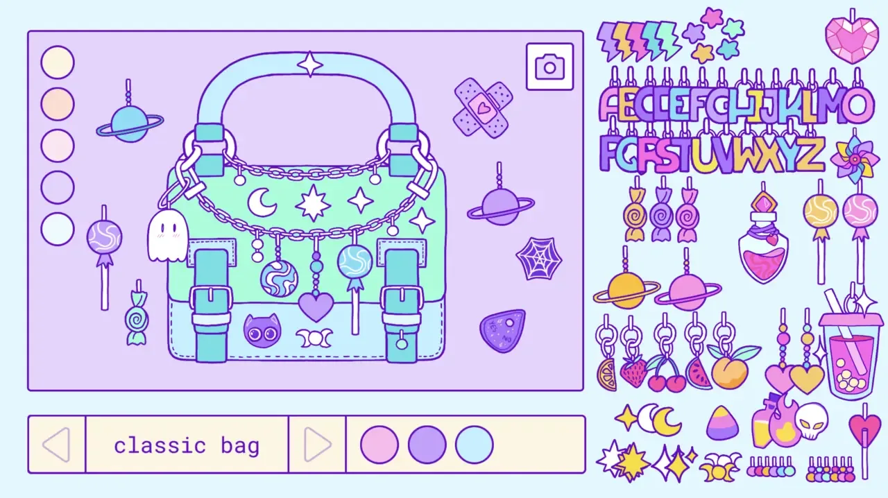 Trinket Bag Maker is a retro sandbox game inspired by the 2000's girl games, where you can create your own trinket bag! Choose between many adorable charms and bags to create the trinket bag of your dreams!
