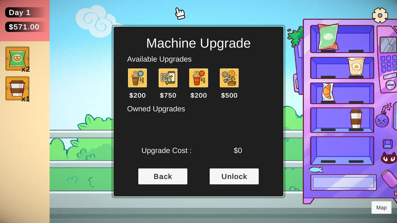 ¡Dirige tu empresa de máquinas expendedoras kawaii! Un relajante juego de simulación en el que diriges tu propia empresa de máquinas expendedoras en una encantadora ciudad japonesa. Elige barrios, abastécete de refrescos y fija el precio perfecto. Mejora tus máquinas y mantenlas abastecidas, ¡un refresco cada vez!