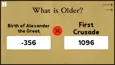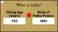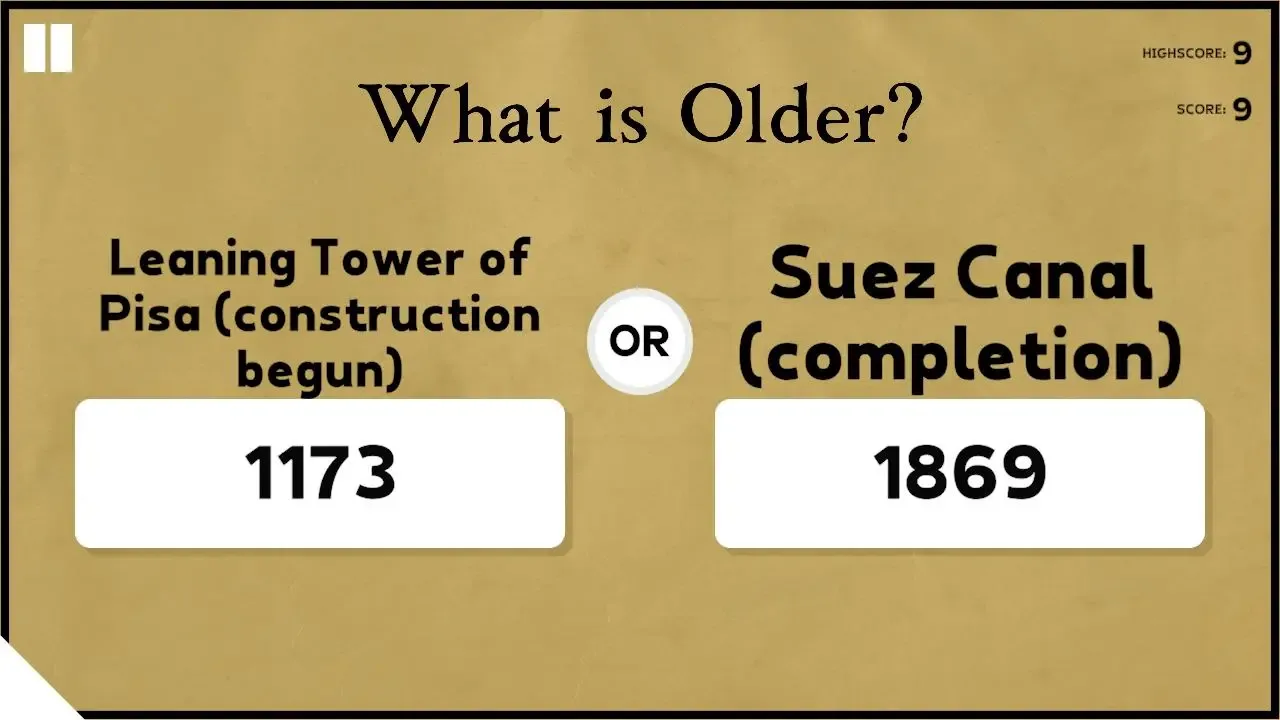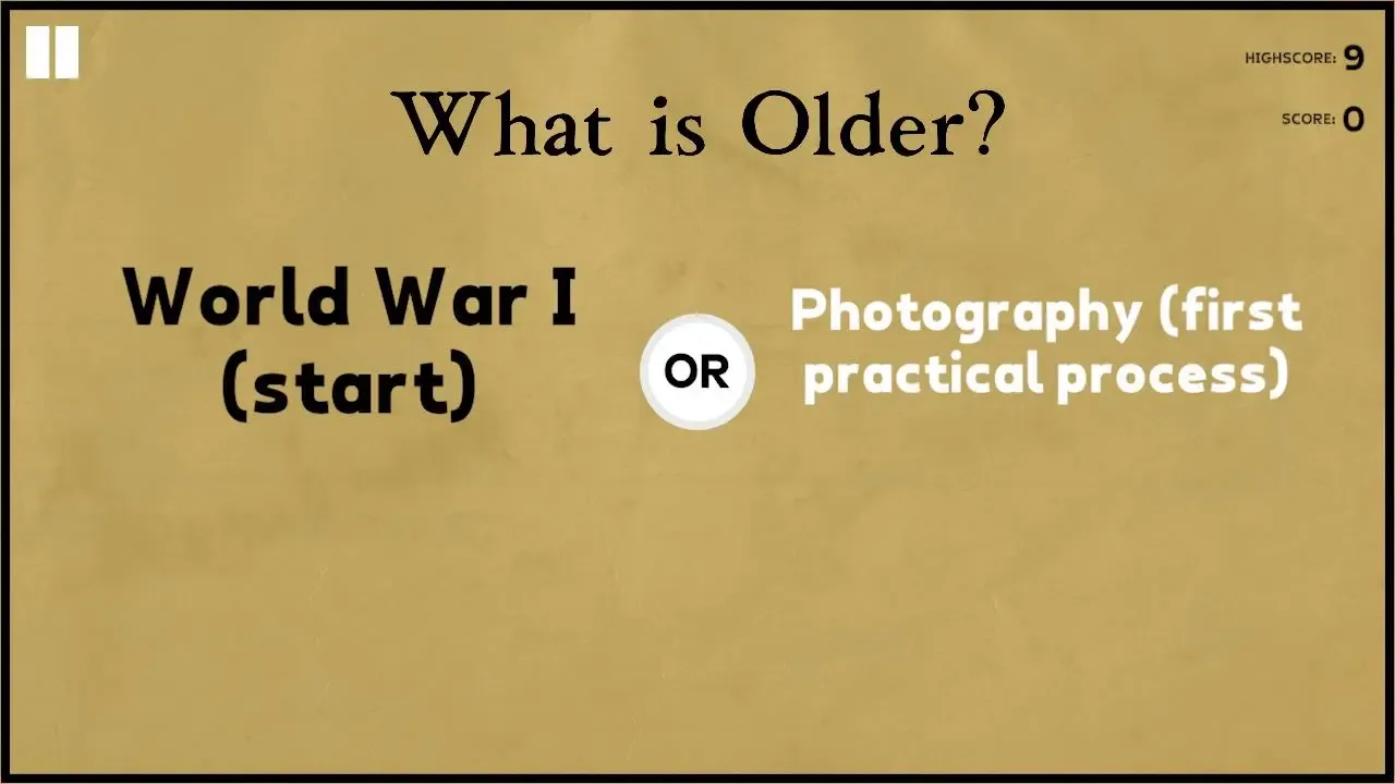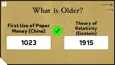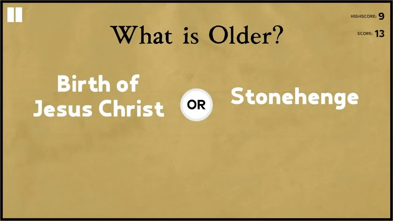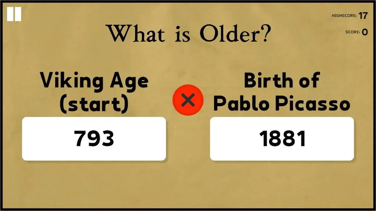¿Qué es más antiguo? es un divertido juego de ingenio en el que debes elegir qué acontecimiento histórico, invento o hito ocurrió primero. Desde el fuego hasta los smartphones, ¡pon a prueba tu sentido del tiempo y persigue la máxima puntuación!